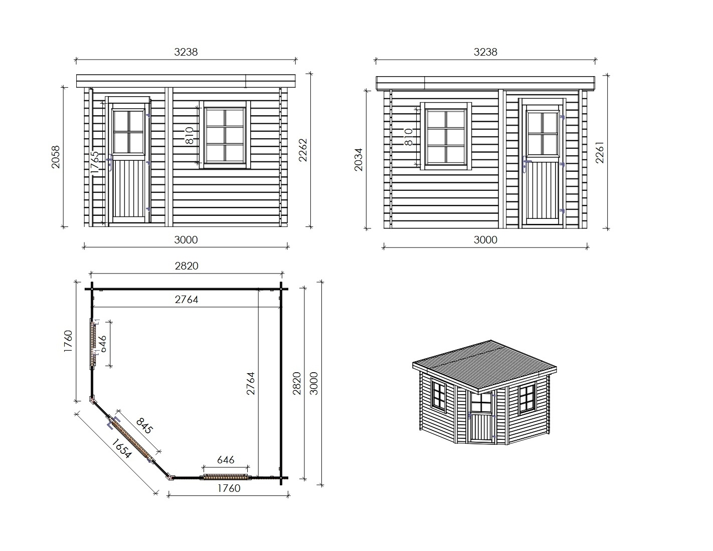 Caseta de madera para herramientas DOM706 de superficie de 8 m2, ancho de 3 m, profundidad de 3 m y espesor de pared de 28 mm. La caseta es fácil de montar, las instrucciones de montaje están incluidas.
