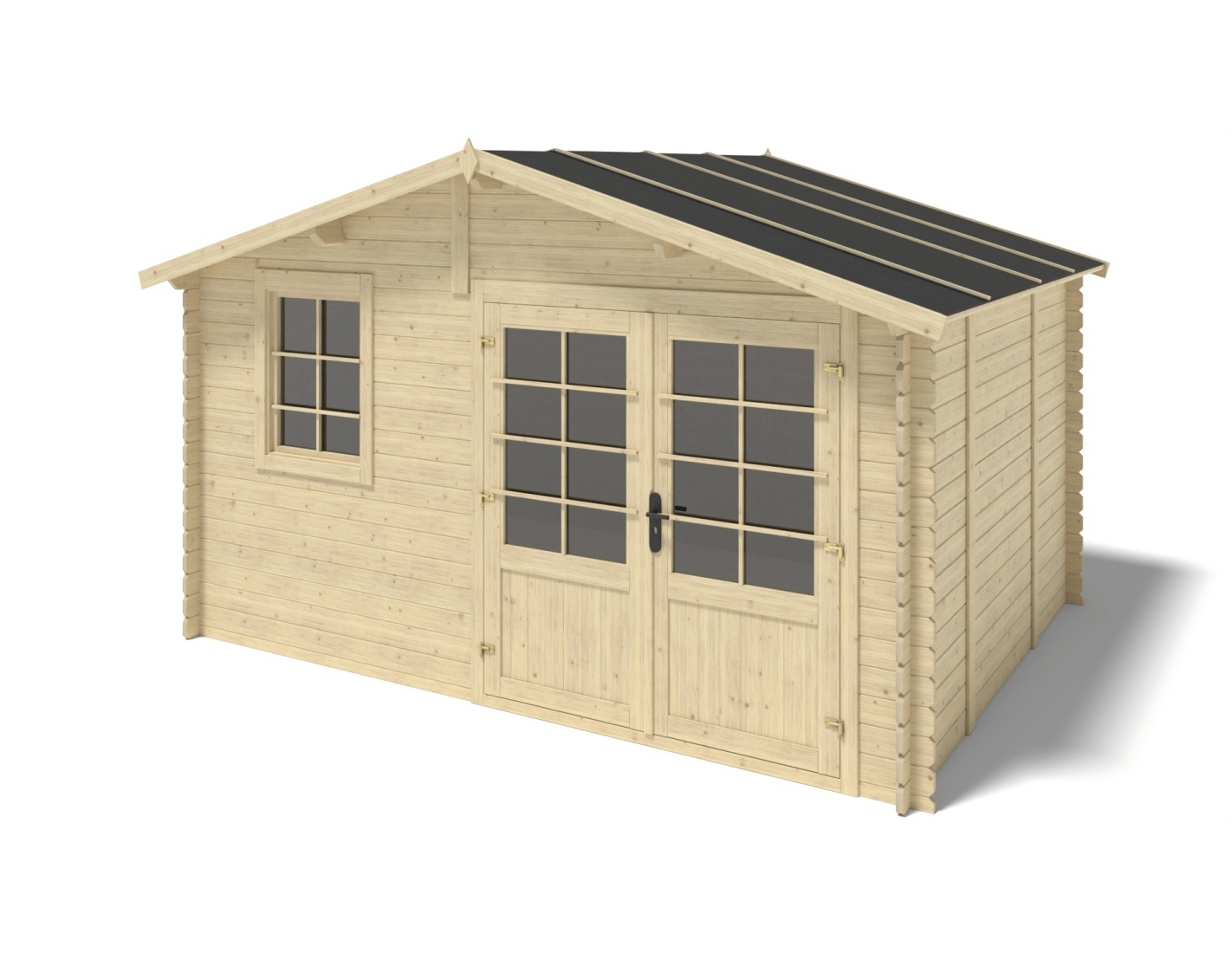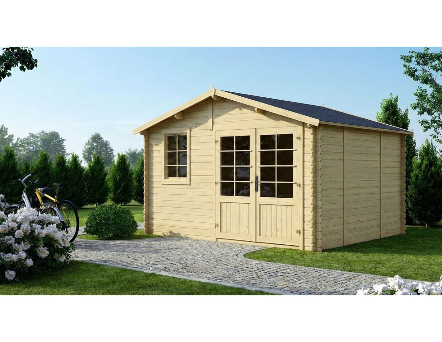 Caseta de madera para herramientas DOM710 de superficie de 12 m2, ancho de 4 m, profundidad de 3 m y espesor de pared de 28 mm. La caseta es fácil de montar, las instrucciones de montaje están incluidas.