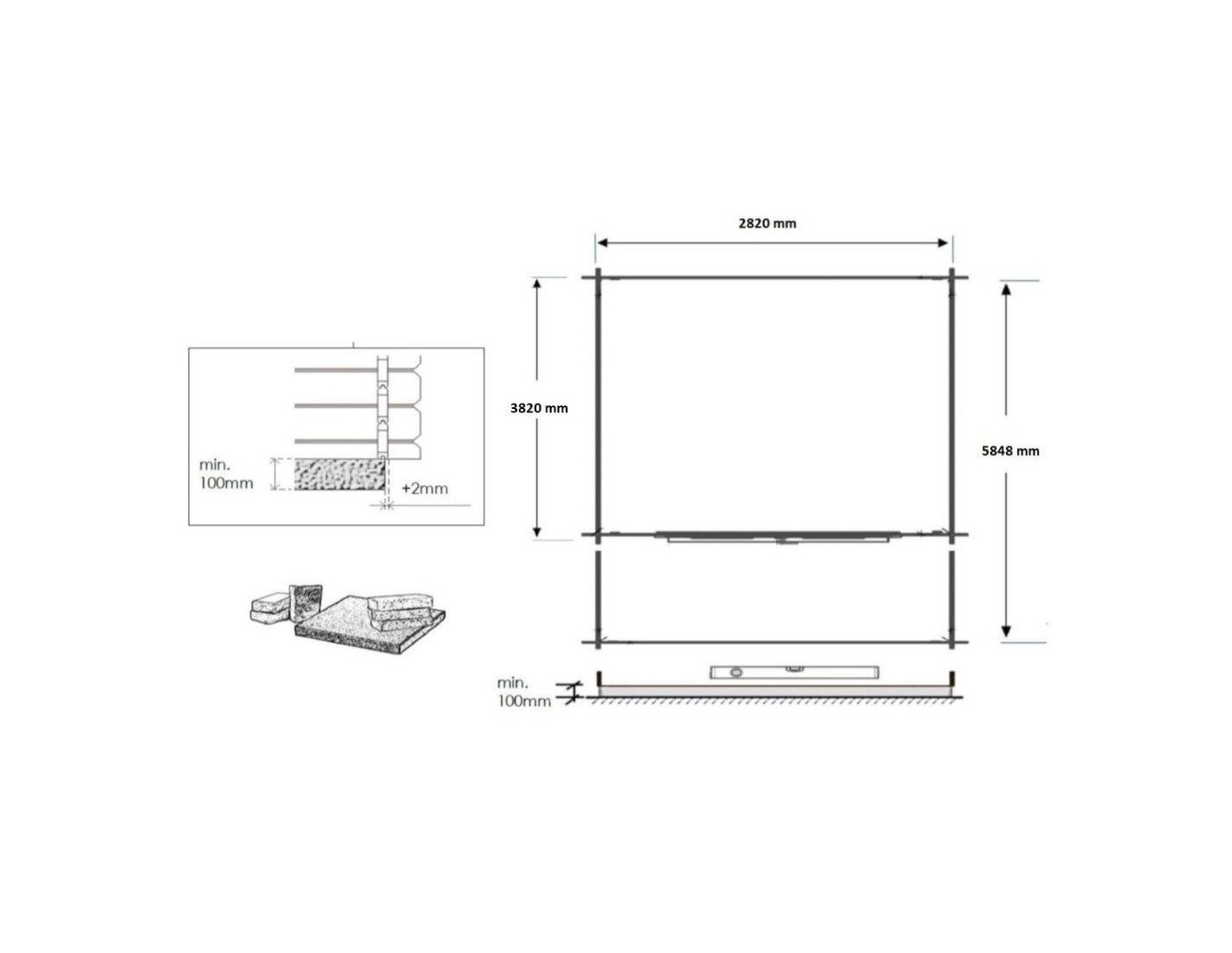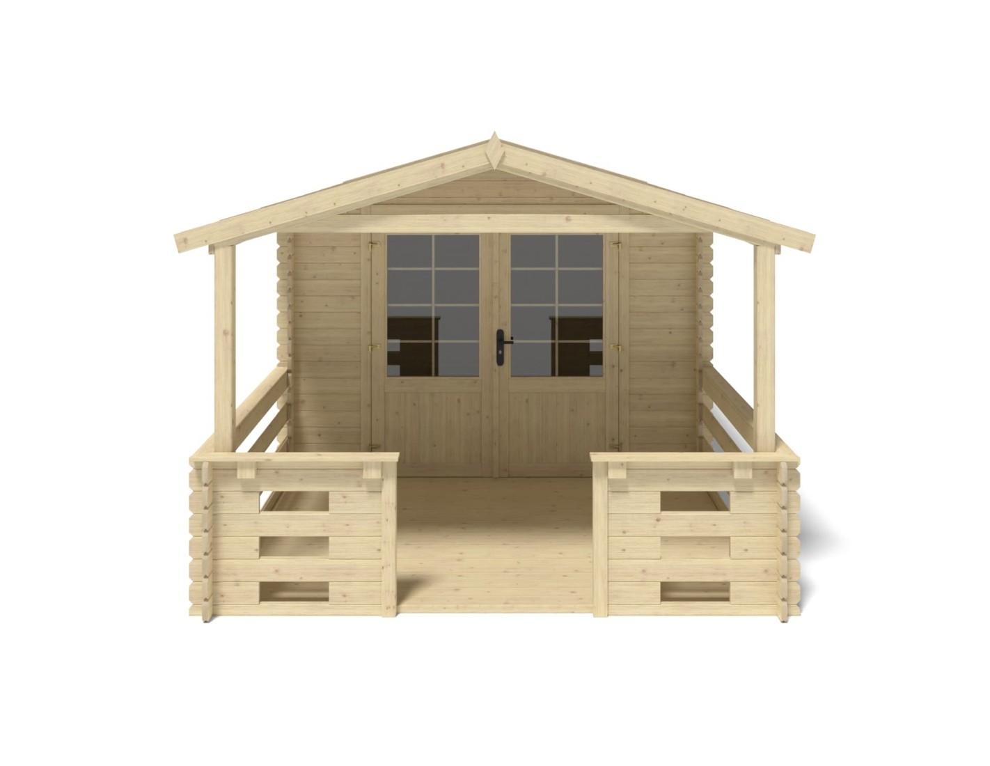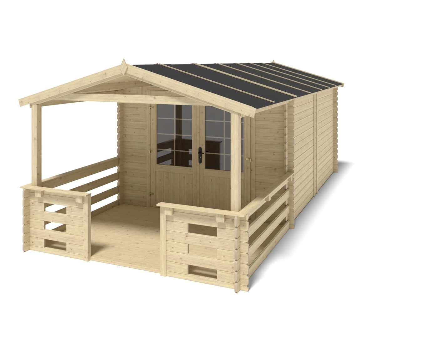 Caseta de jardín con terraza, de superficie de 18 m2, ancho frontal 3 m, profundidad 4 m y espesor de pared de 28 mm.