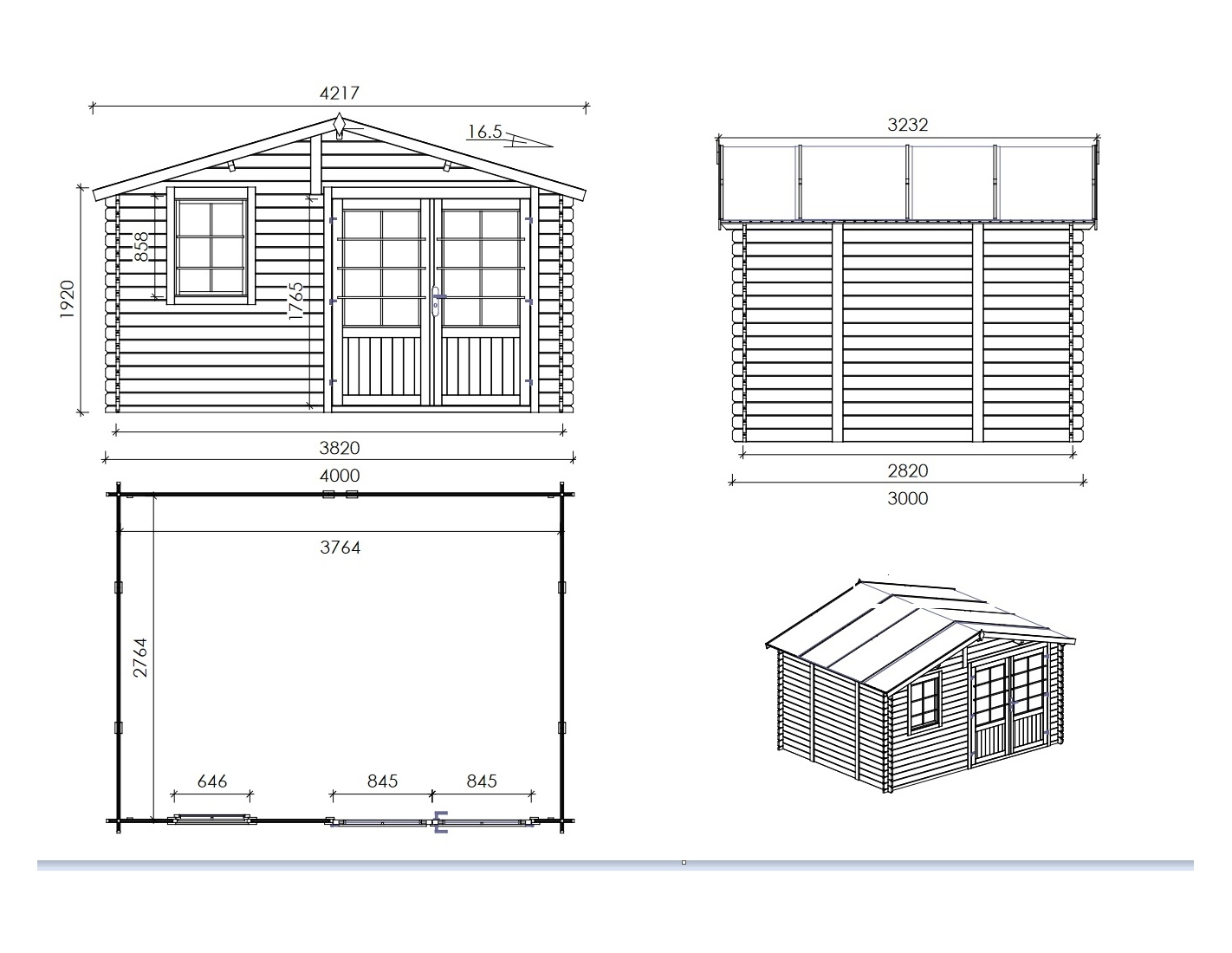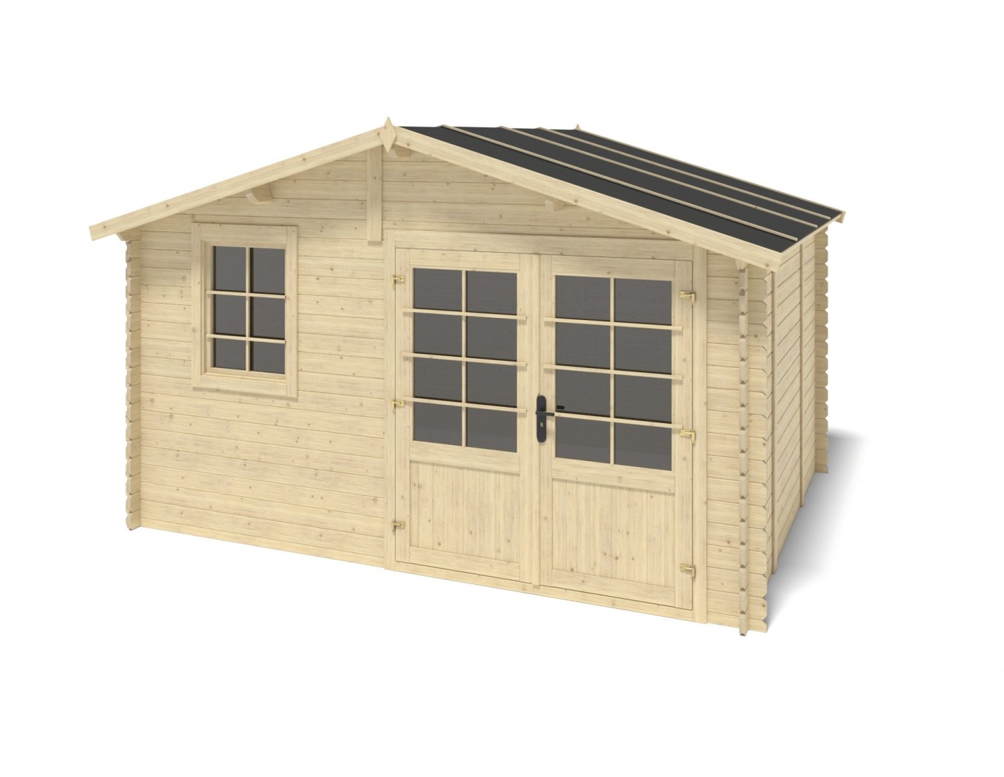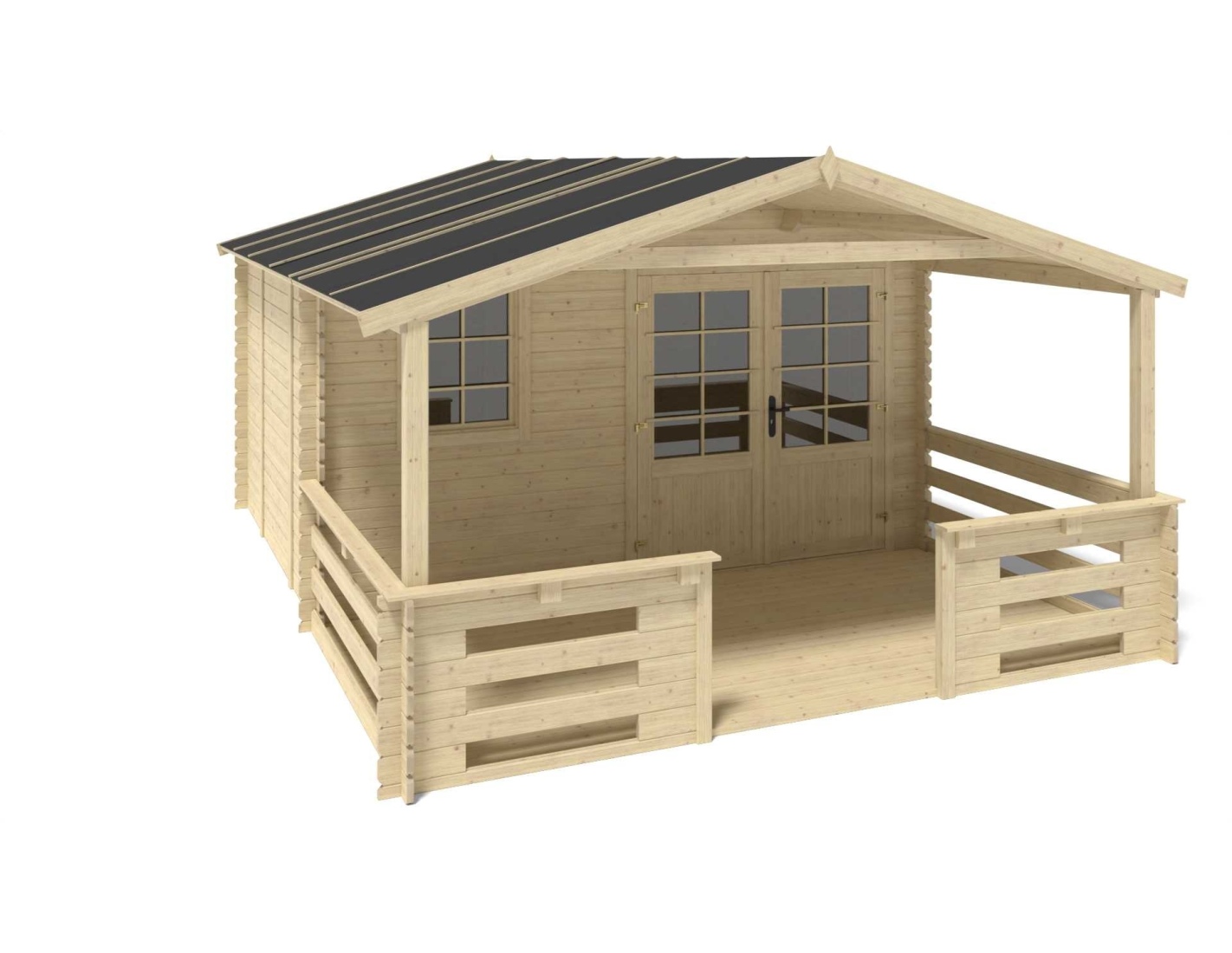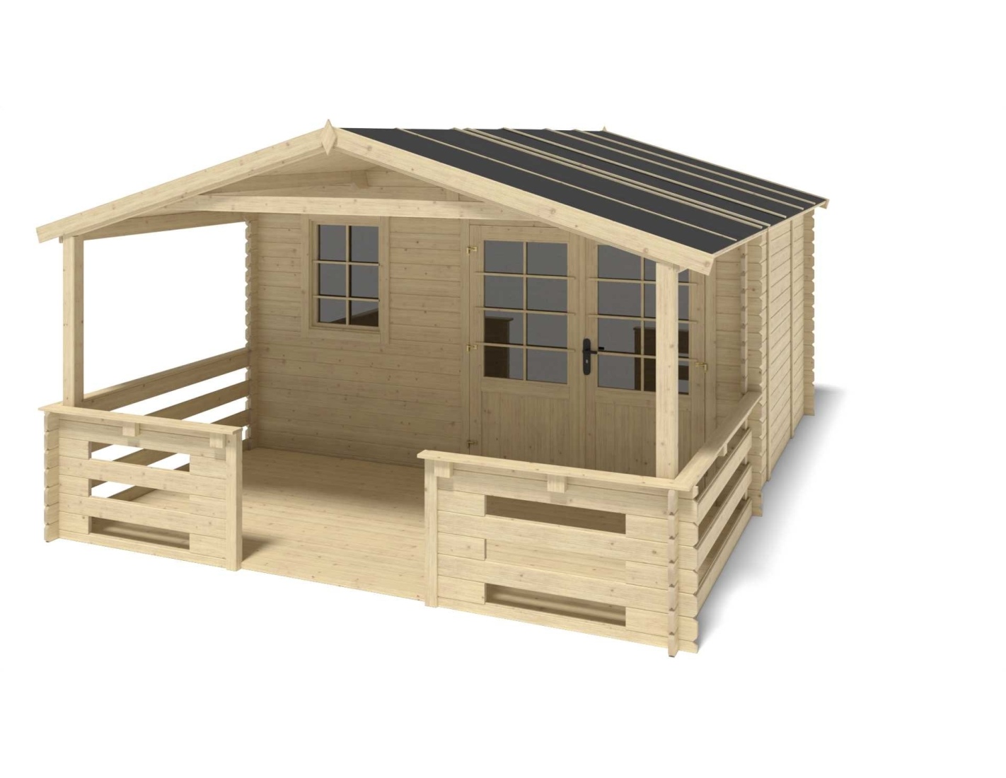 Caseta de jardín con terraza, de superficie de 20 m2, ancho frontal 4 m, profundidad 3 m y espesor de pared de 28 mm.