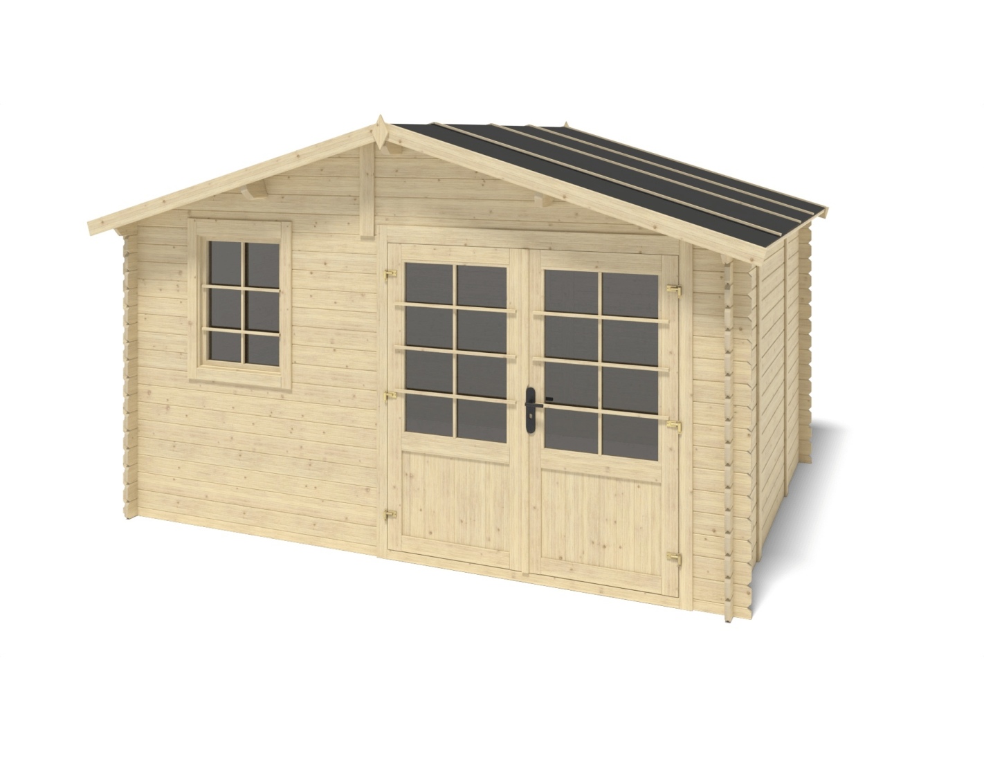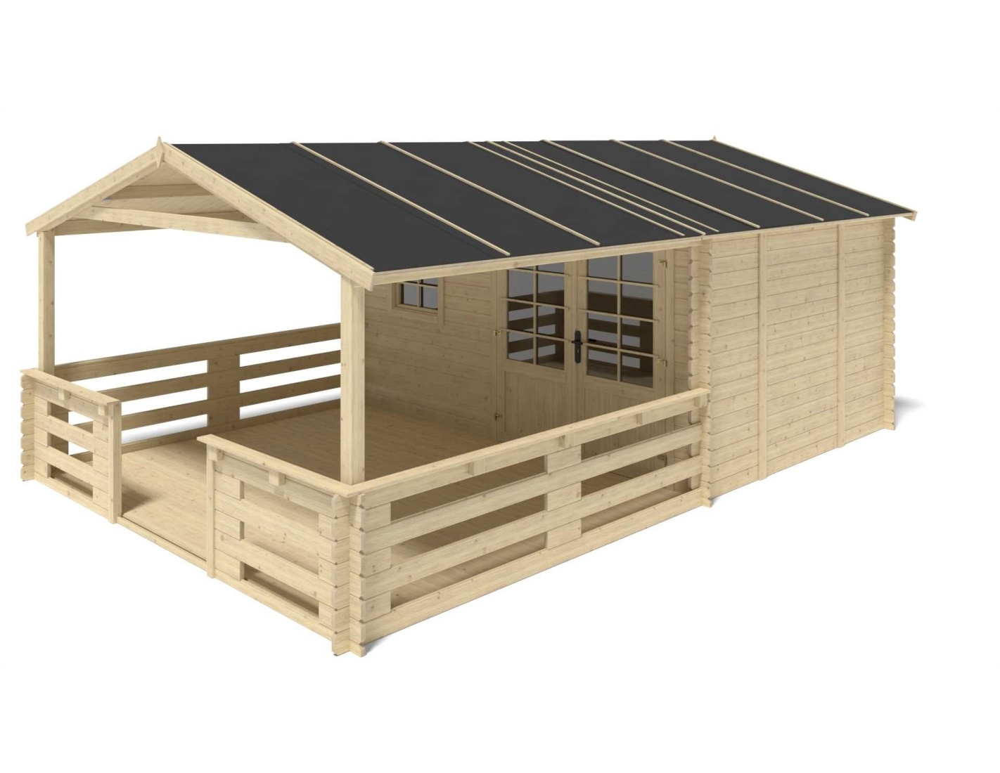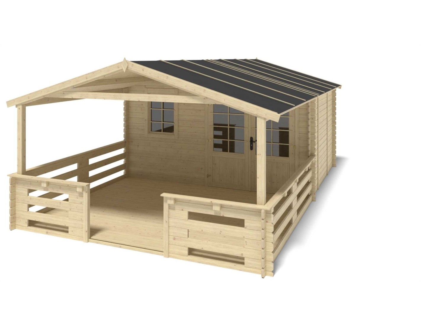 Caseta de jardín con terraza, de superficie de 24 m2, ancho frontal 4 m, profundidad 3 m y espesor de pared de 28 mm.