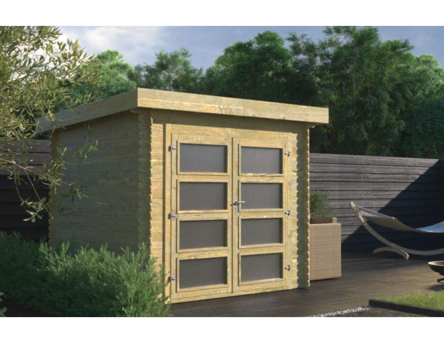 Caseta de madera para herramientas DOM230 de superficie de 6 m2, ancho de 2.46 m, profundidad de 2.46 m y espesor de pared de 19 mm. La caseta es fácil de montar, las instrucciones de montaje están incluidas.