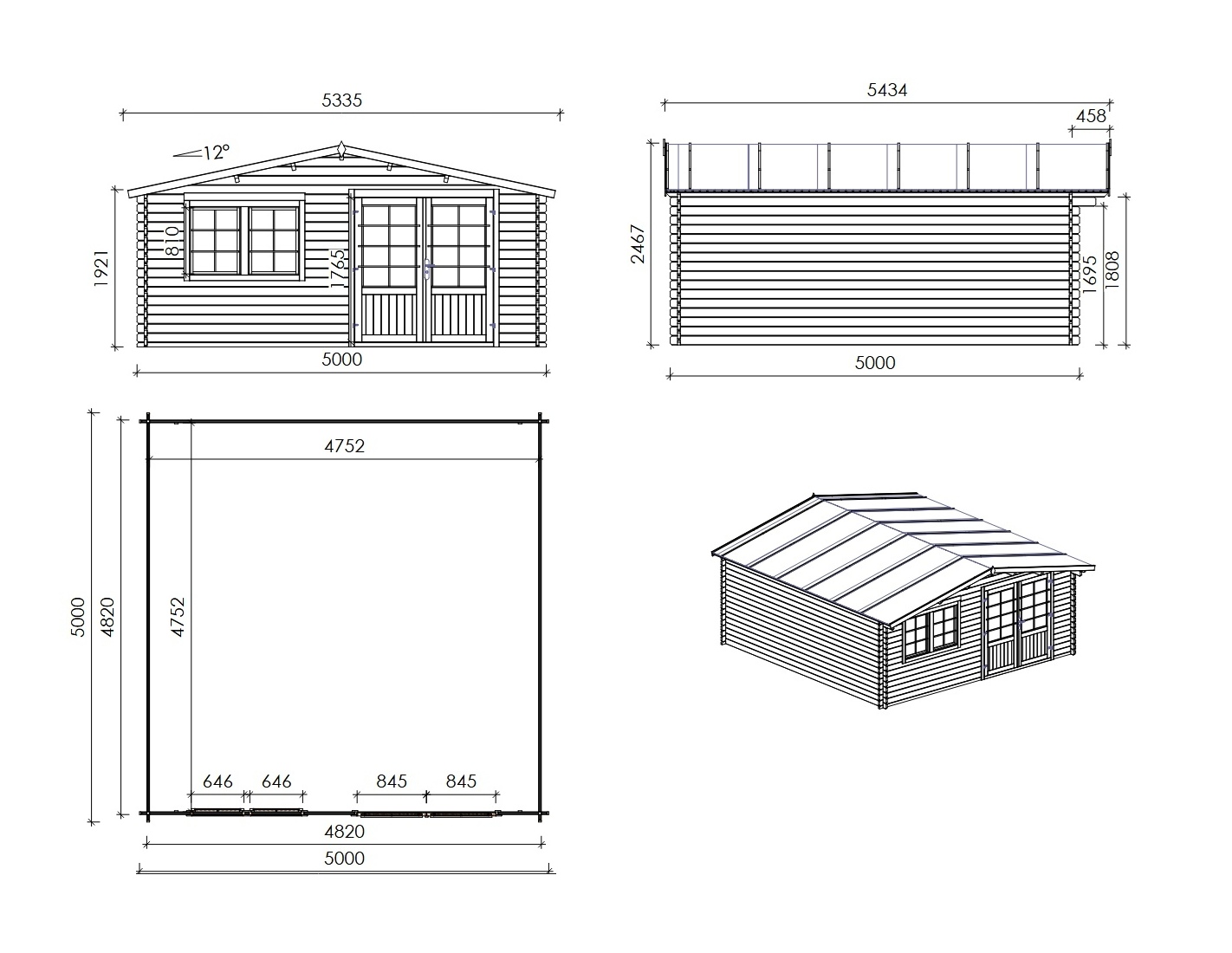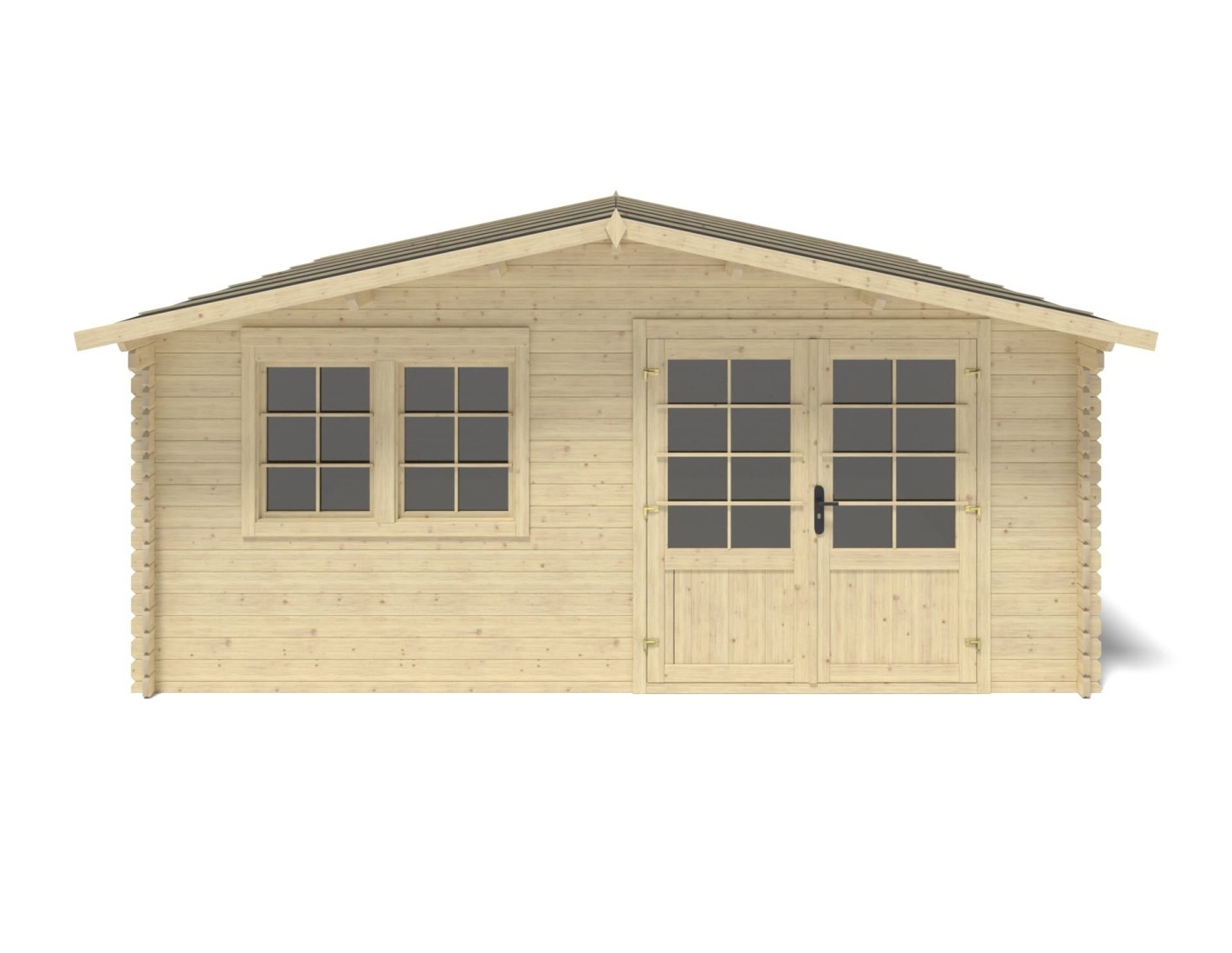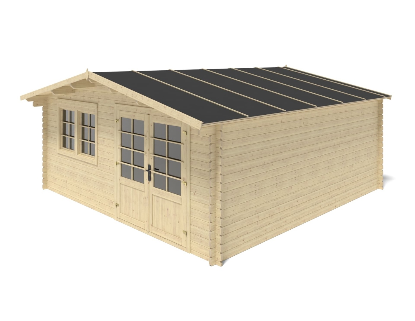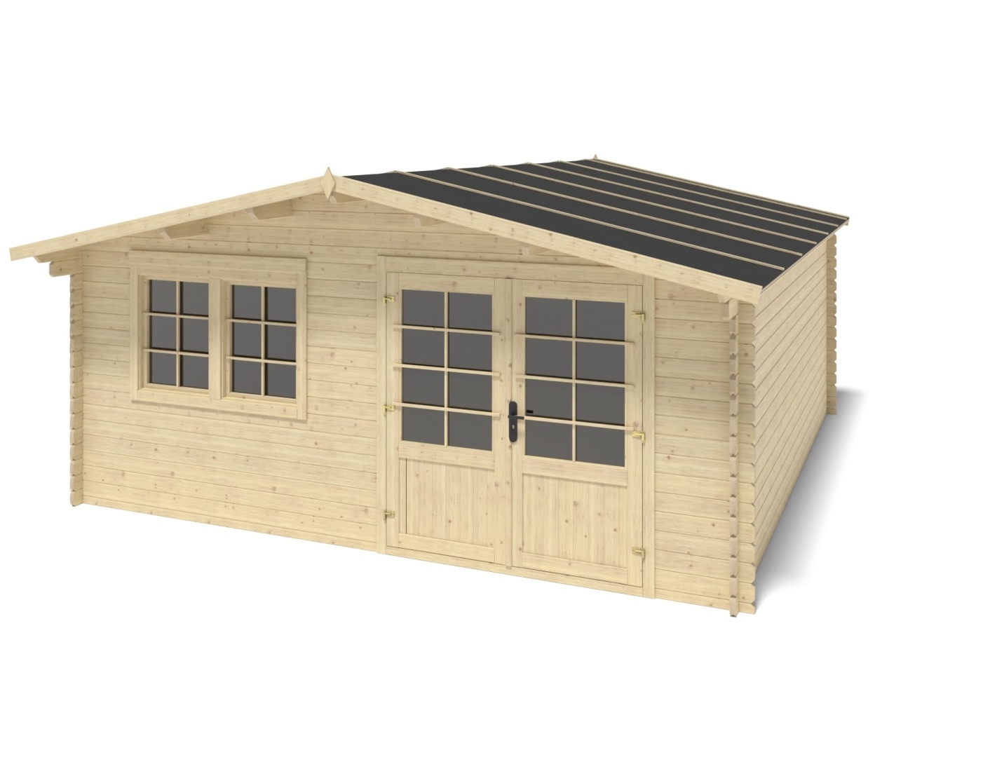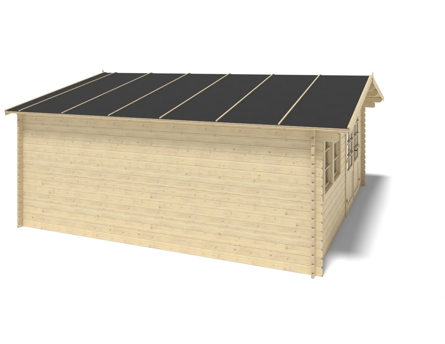 Caseta de madera para herramientas DOM722 de superficie de 25 m2, ancho de 5 m, profundidad de 5 m y espesor de pared de 34 mm. La caseta es fácil de montar, las instrucciones de montaje están incluidas.