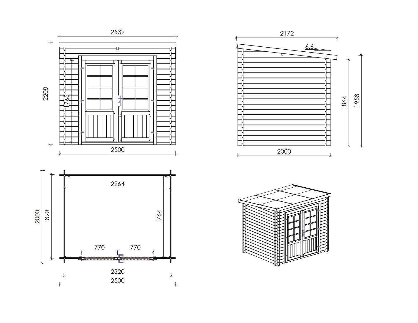 Caseta de madera para herramientas DOM725 de superficie de 5 m2, ancho de 2.5 m, profundidad de 2 m y espesor de pared de 28 mm. La caseta es fácil de montar, las instrucciones de montaje están incluidas.