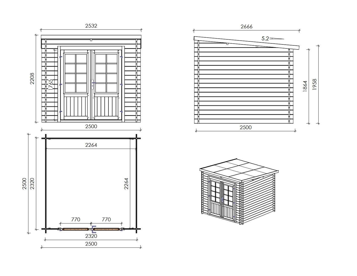 Caseta de madera para herramientas DOM724 de superficie de 6.25 m2, ancho de 2.5 m, profundidad de 2.5 m y espesor de pared de 28 mm. La caseta es fácil de montar, las instrucciones de montaje están incluidas.