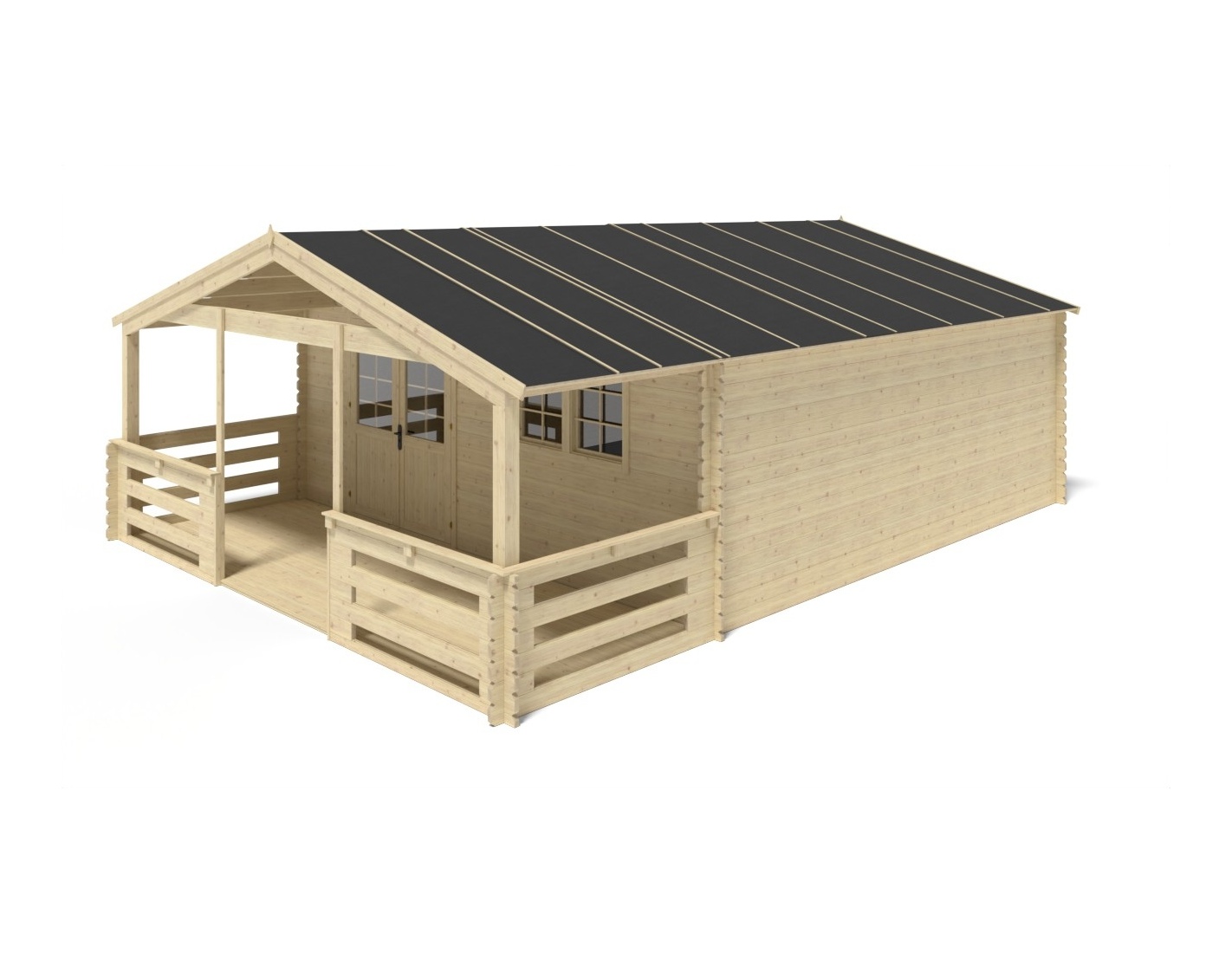 Caseta de jardín con terraza, de superficie de 48 m2, ancho frontal 6 m, profundidad 6 m y espesor de pared de 40 mm.