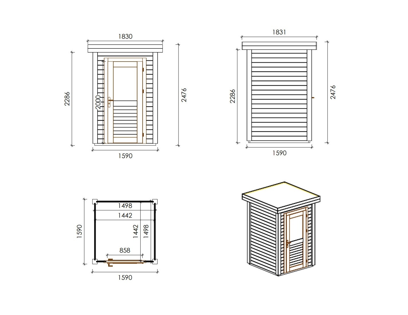 Caseta de madera para herramientas 000010 de superficie de 2.53 m2, ancho de 1.59 m, profundidad de 1.59 m y espesor de pared de 28 mm. La caseta es fácil de montar, las instrucciones de montaje están incluidas.