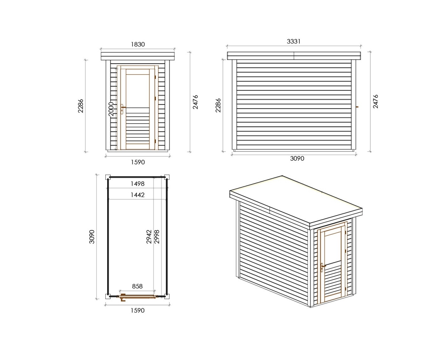 Caseta de madera para herramientas 000013 de superficie de 4.91 m2, ancho de 1.59 m, profundidad de 3.09 m y espesor de pared de 28 mm. La caseta es fácil de montar, las instrucciones de montaje están incluidas.