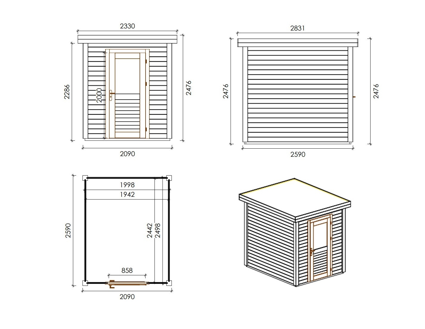 Caseta de madera para herramientas 000016 de superficie de 5.41 m2, ancho de 2.09 m, profundidad de 2.59 m y espesor de pared de 28 mm. La caseta es fácil de montar, las instrucciones de montaje están incluidas.