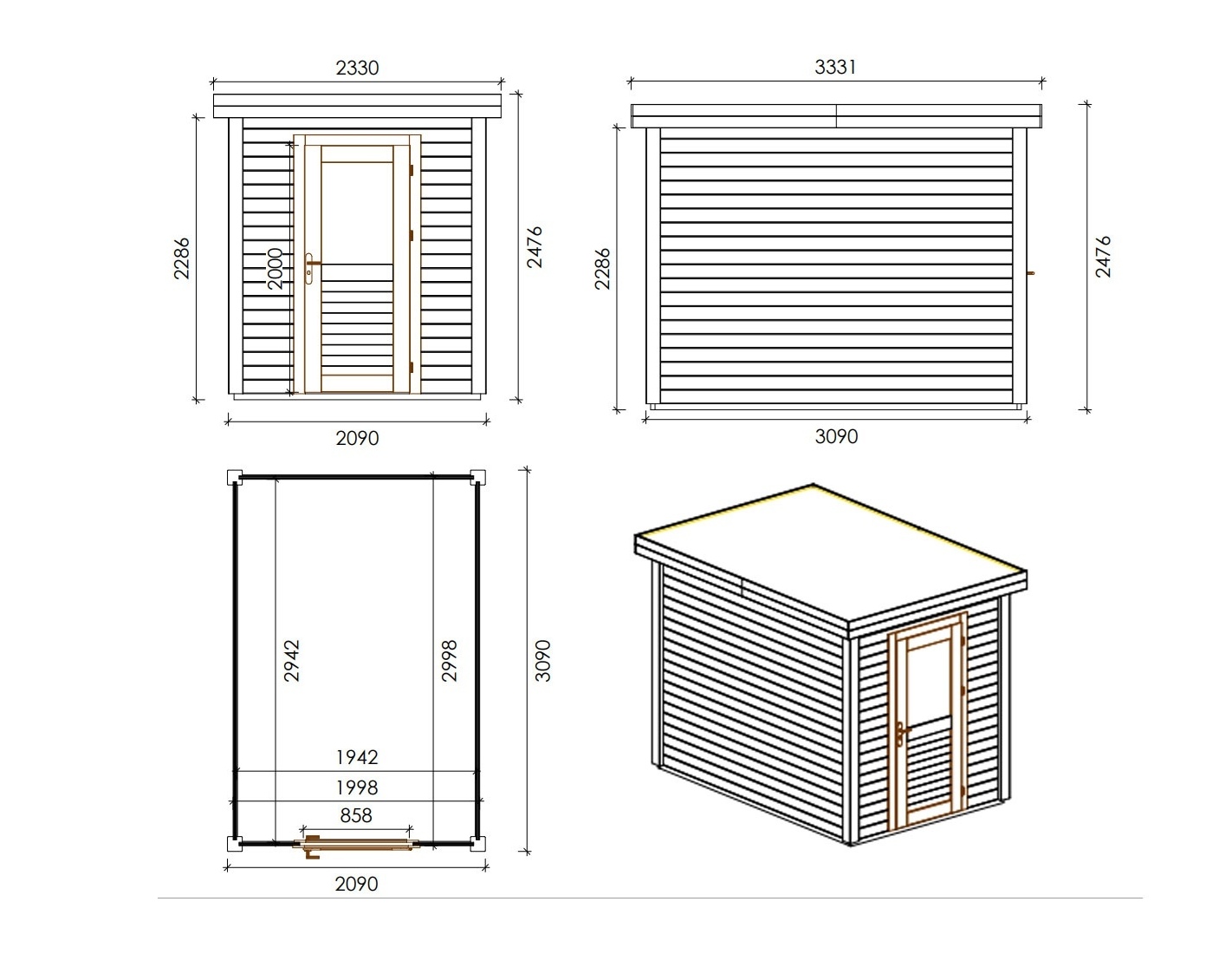 Caseta de madera para herramientas 000017 de superficie de 6.46 m2, ancho de 2.09 m, profundidad de 3.09 m y espesor de pared de 28 mm. La caseta es fácil de montar, las instrucciones de montaje están incluidas.