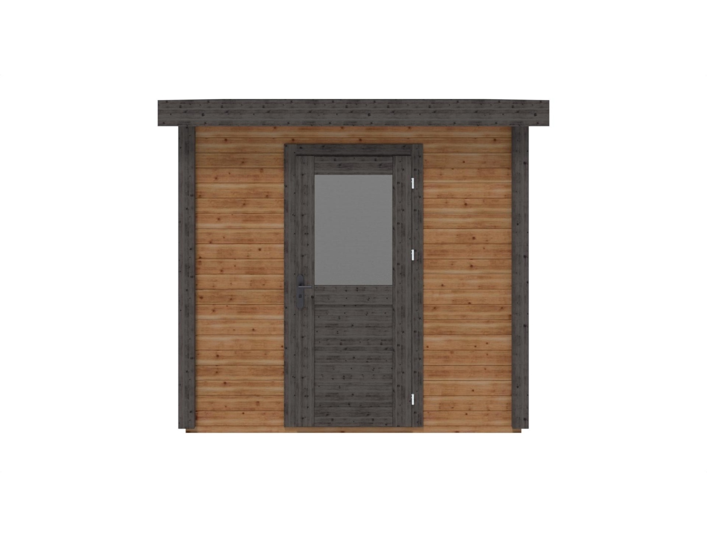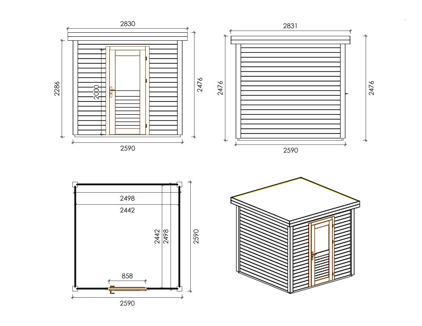 Caseta de madera para herramientas 000020 de superficie de 6.71 m2, ancho de 2.59 m, profundidad de 2.59 m y espesor de pared de 28 mm. La caseta es fácil de montar, las instrucciones de montaje están incluidas.