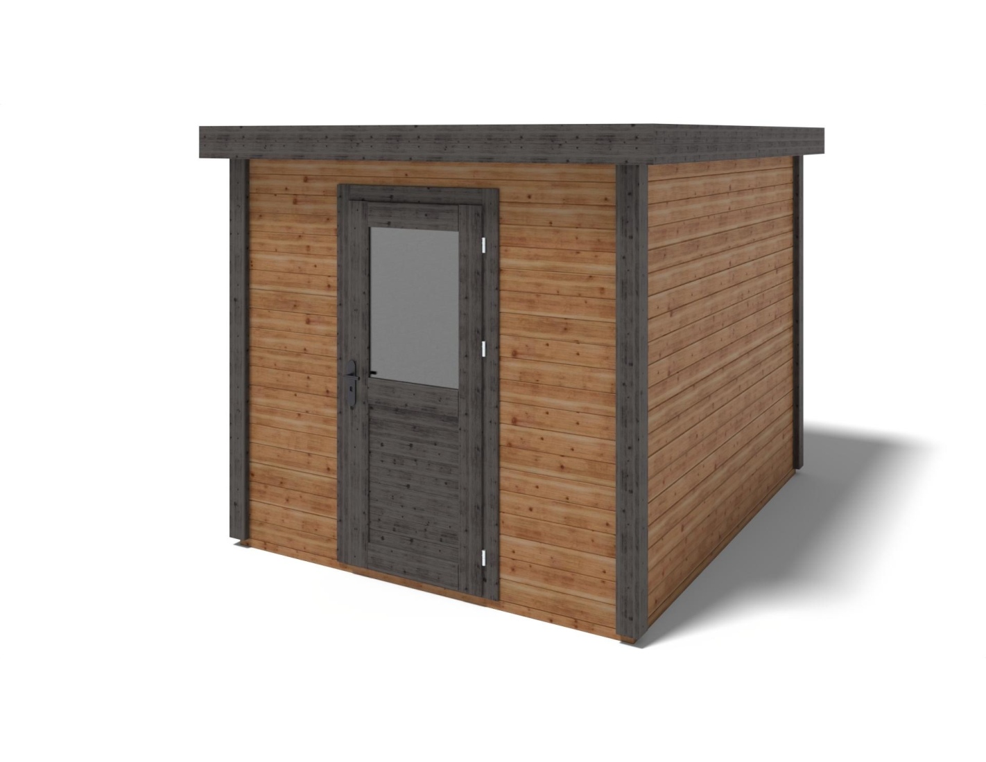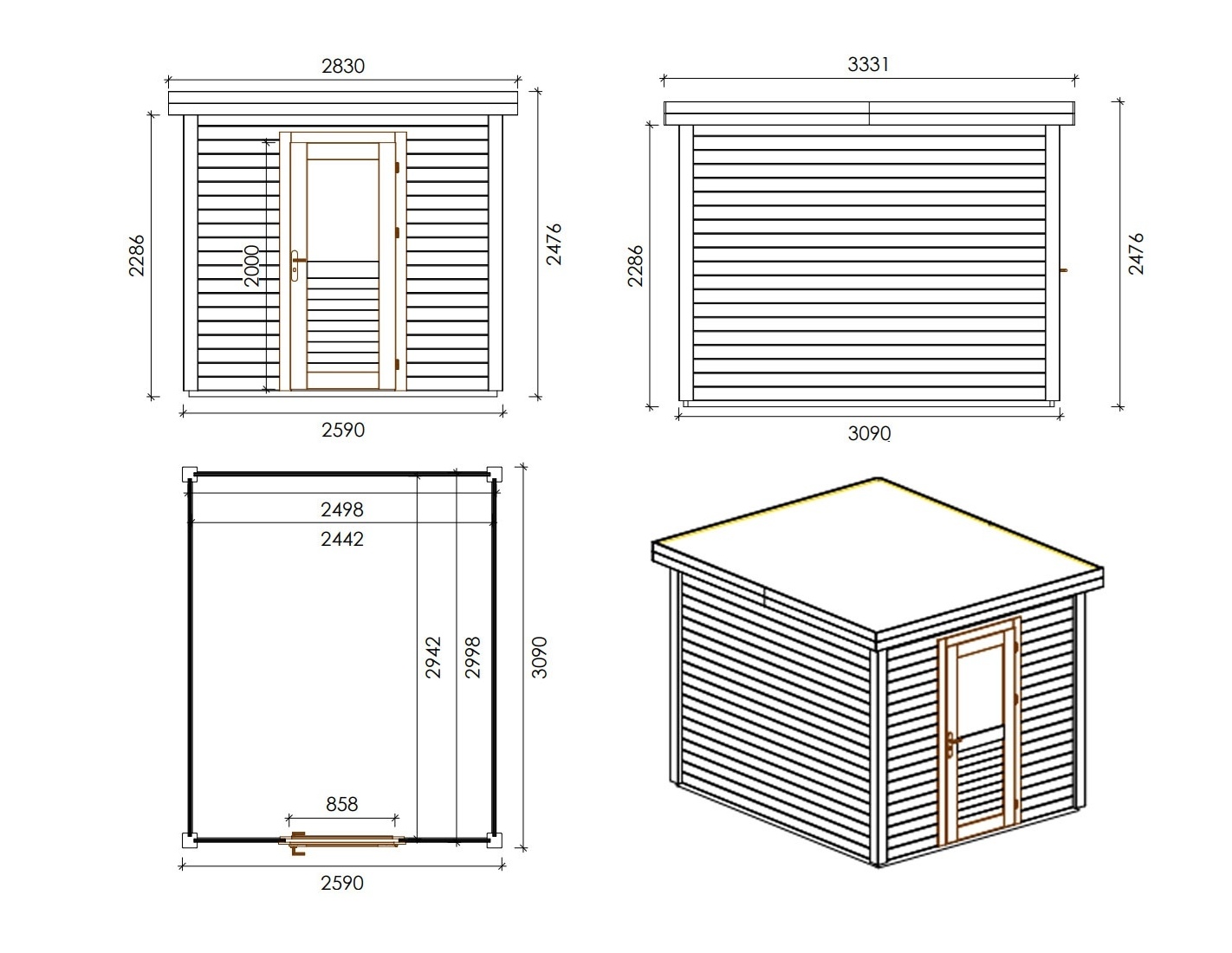 Caseta de madera para herramientas 000021 de superficie de 8 m2, ancho de 2.59 m, profundidad de 3.09 m y espesor de pared de 28 mm. La caseta es fácil de montar, las instrucciones de montaje están incluidas.