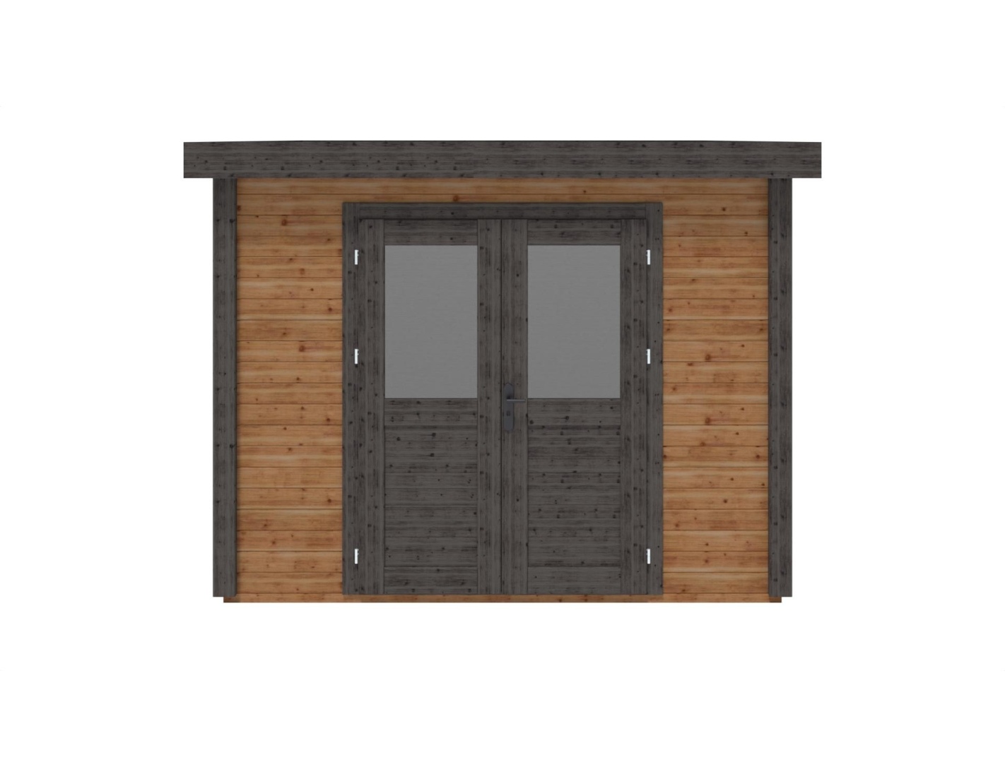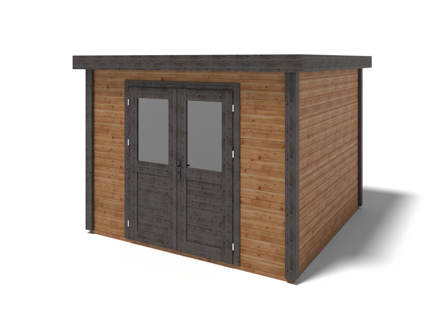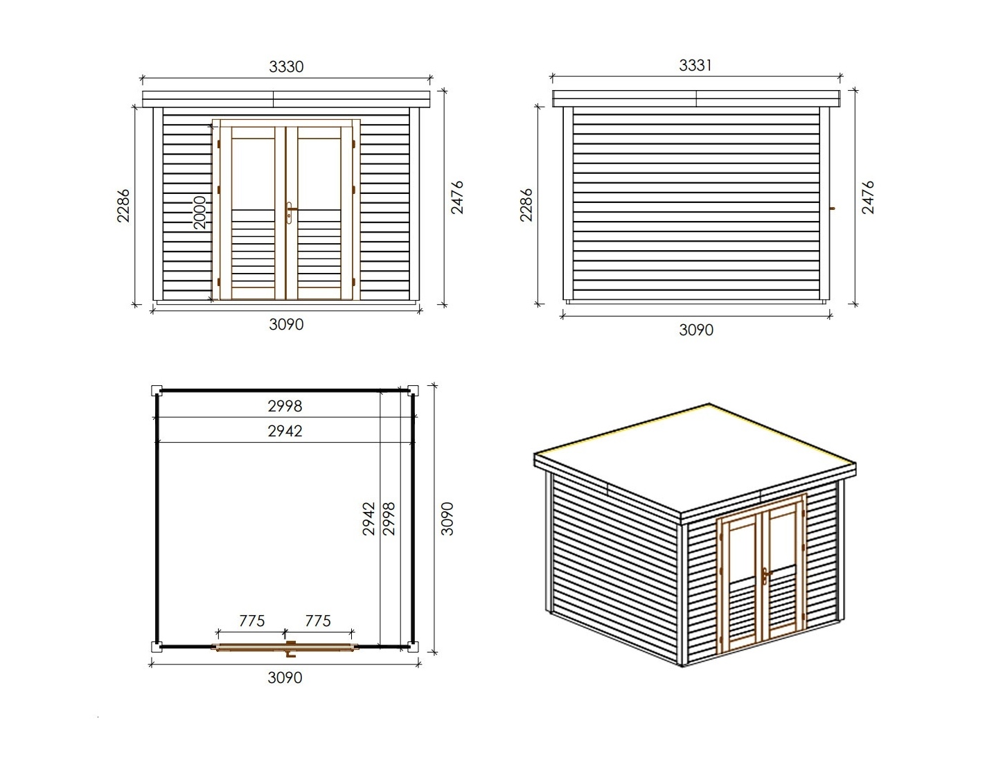 Caseta de madera para herramientas 000023 de superficie de 9.55 m2, ancho de 3.09 m, profundidad de 3.09 m y espesor de pared de 28 mm. La caseta es fácil de montar, las instrucciones de montaje están incluidas.