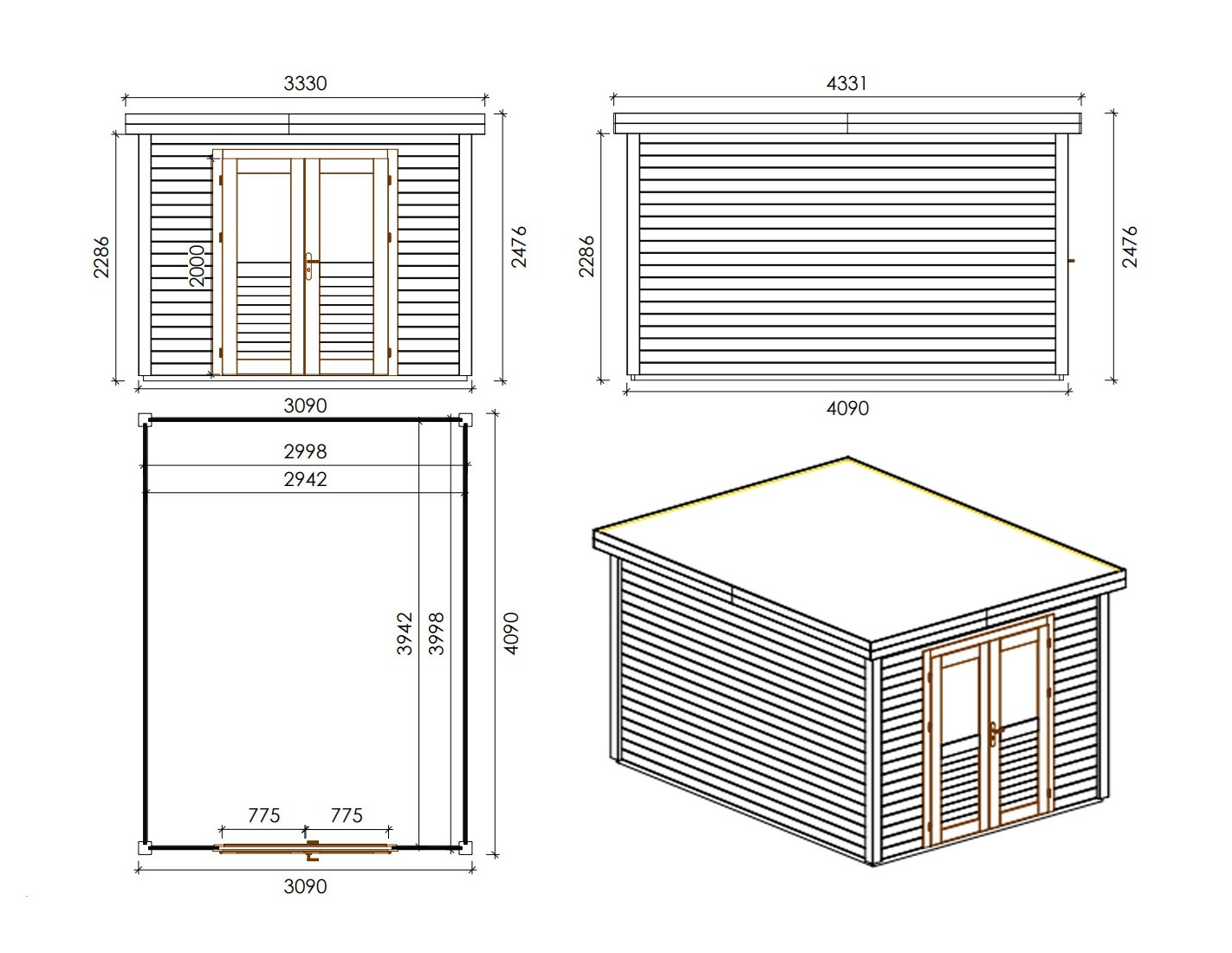 Caseta de madera para herramientas 000024 de superficie de 12.64 m2, ancho de 3.09 m, profundidad de 4.09 m y espesor de pared de 28 mm. La caseta es fácil de montar, las instrucciones de montaje están incluidas.