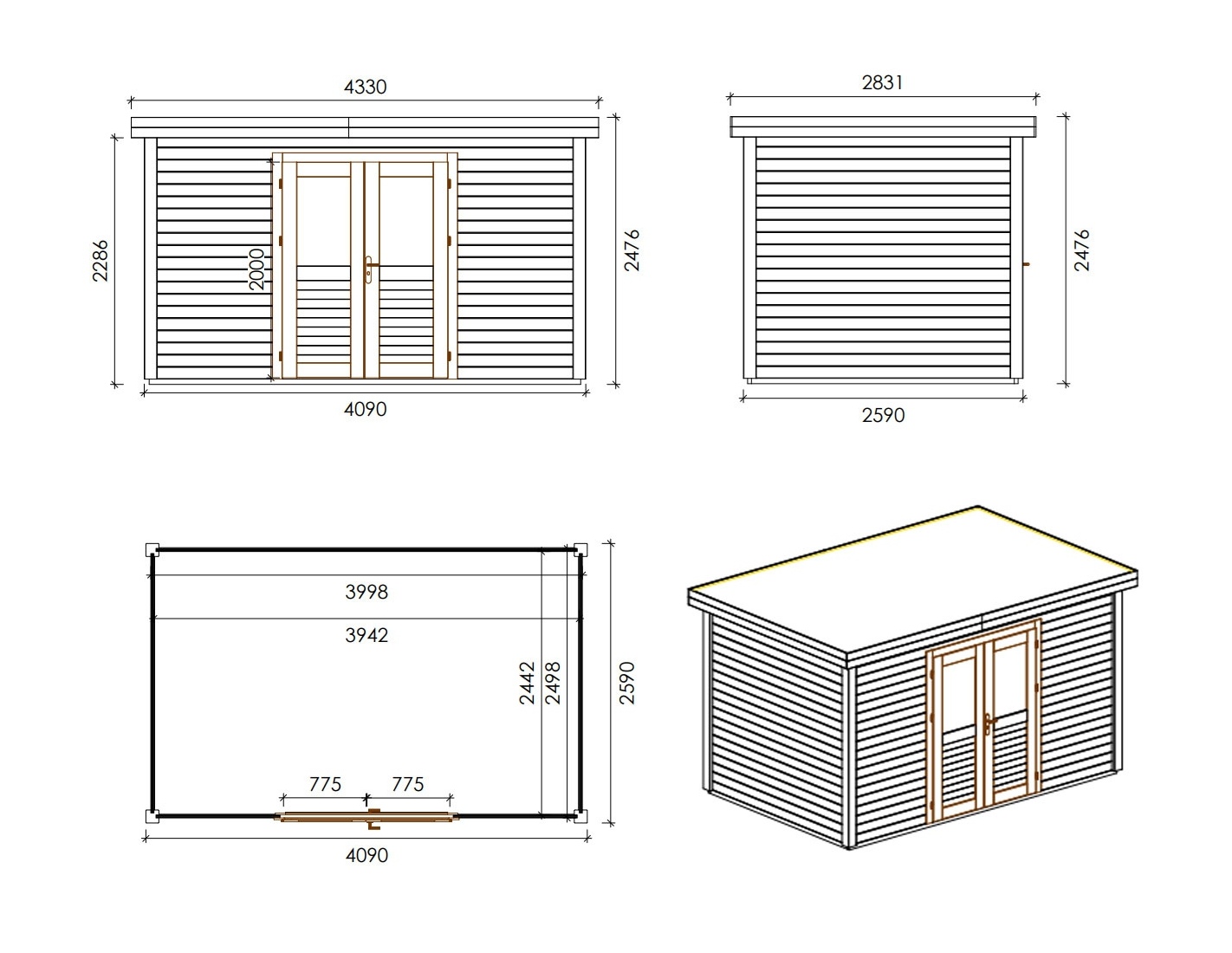 Caseta de madera para herramientas 000025 de superficie de 10.59 m2, ancho de 4.09 m, profundidad de 2.59 m y espesor de pared de 28 mm. La caseta es fácil de montar, las instrucciones de montaje están incluidas.