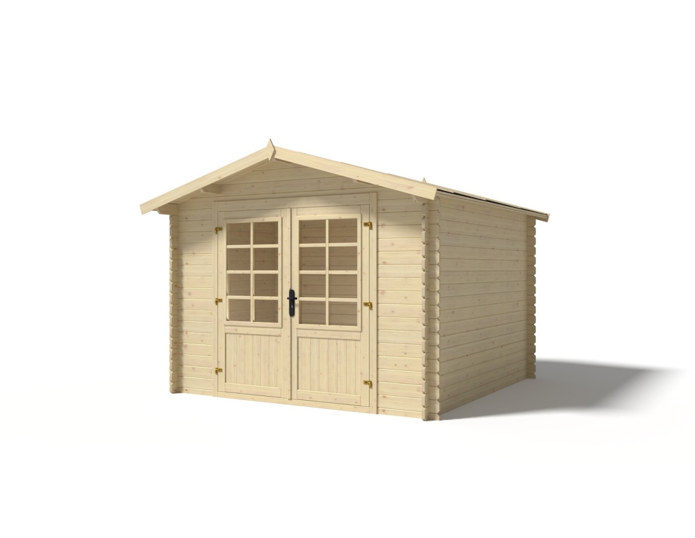 Caseta de madera para herramientas DOM530 de superficie de 9 m2, ancho de 3 m, profundidad de 3 m y espesor de pared de 28 mm. La caseta es fácil de montar, las instrucciones de montaje están incluidas.