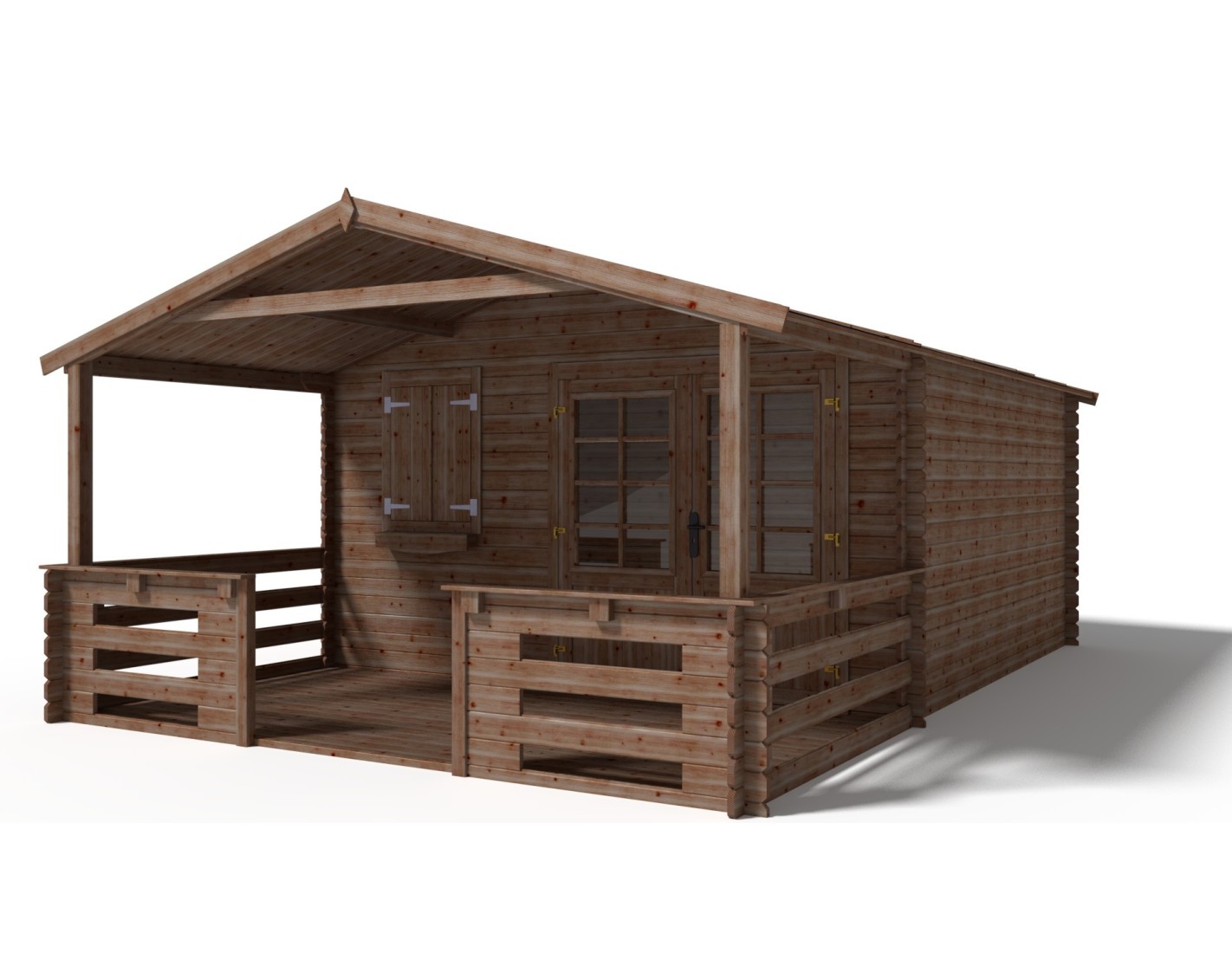 Caseta de jardín con terraza, de superficie de 24 m2, ancho frontal 4 m, profundidad 4 m y espesor de pared de 28 mm.