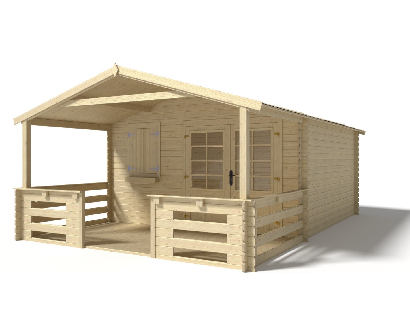 Caseta de jardín con terraza, de superficie de 24 m2, ancho frontal 4 m, profundidad 4 m y espesor de pared de 28 mm.