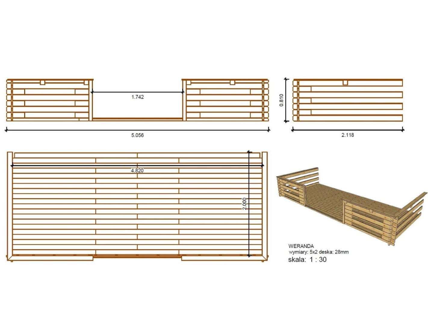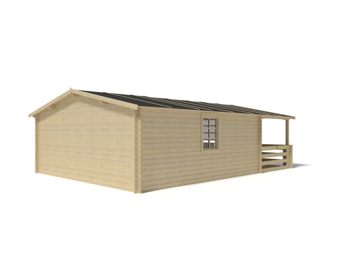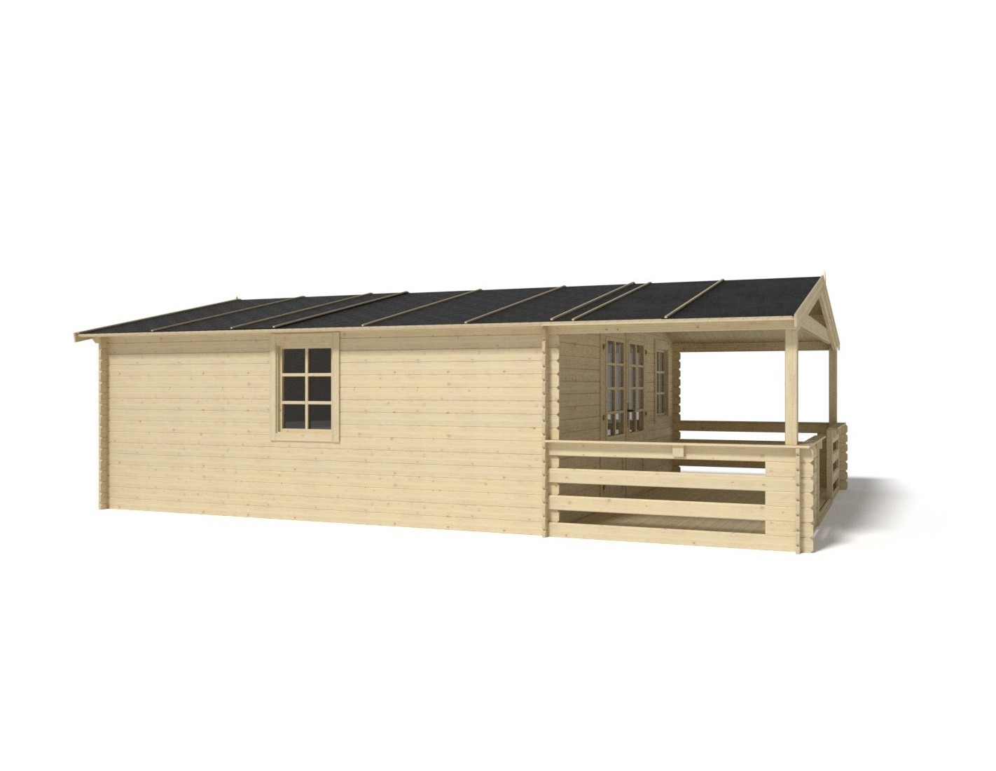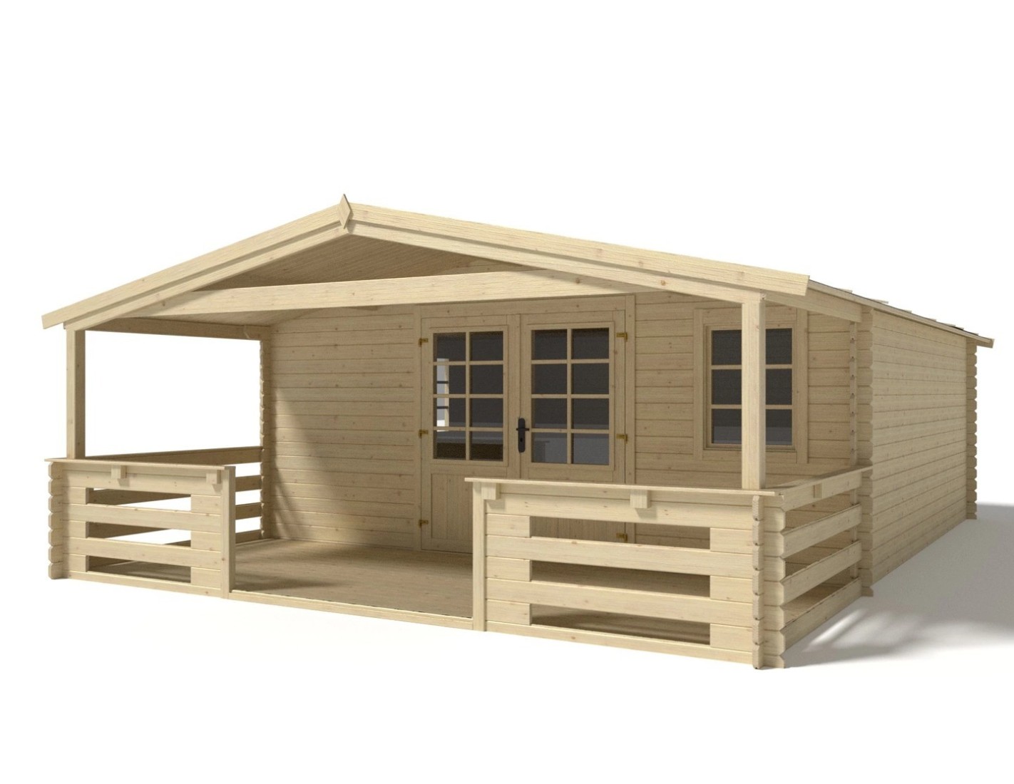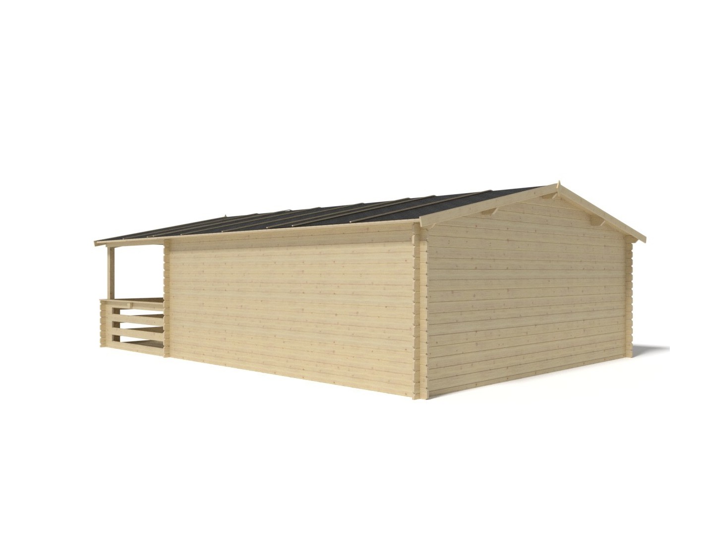 Caseta de jardín con terraza, de superficie de 35 m2, ancho frontal 5 m, profundidad 5 m y espesor de pared de 28 mm.