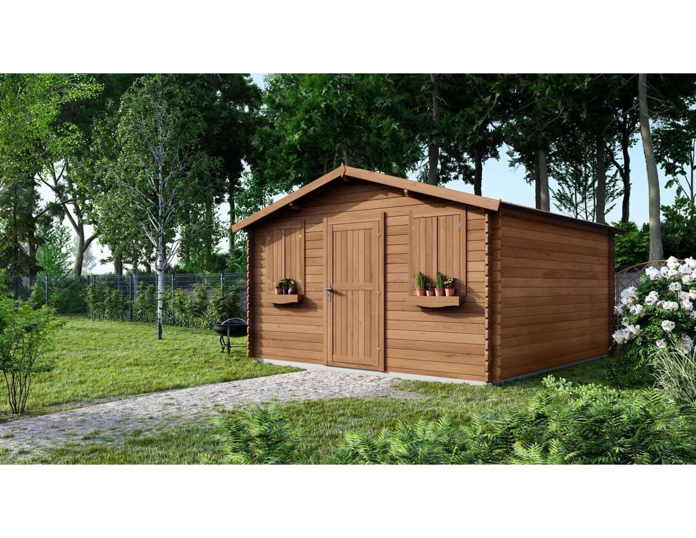 Caseta de madera para herramientas DOM144 de superficie de 16 m2, ancho de 4 m, profundidad de 4 m y espesor de pared de 28 mm. La caseta es fácil de montar, las instrucciones de montaje están incluidas.