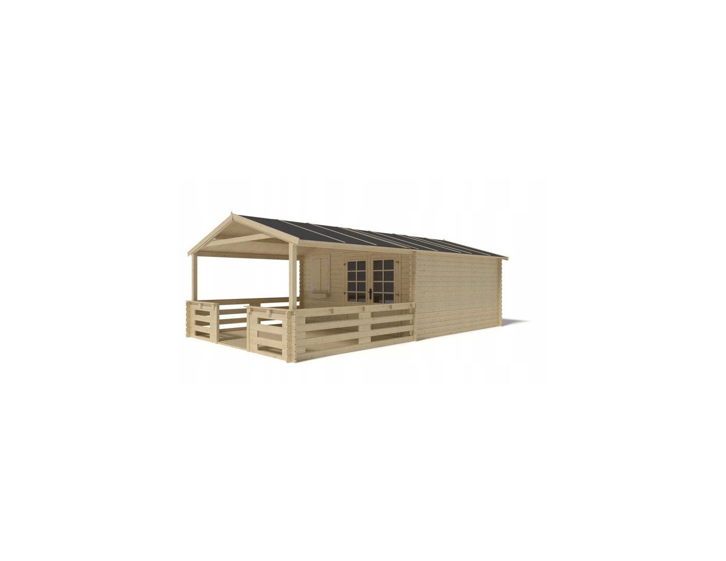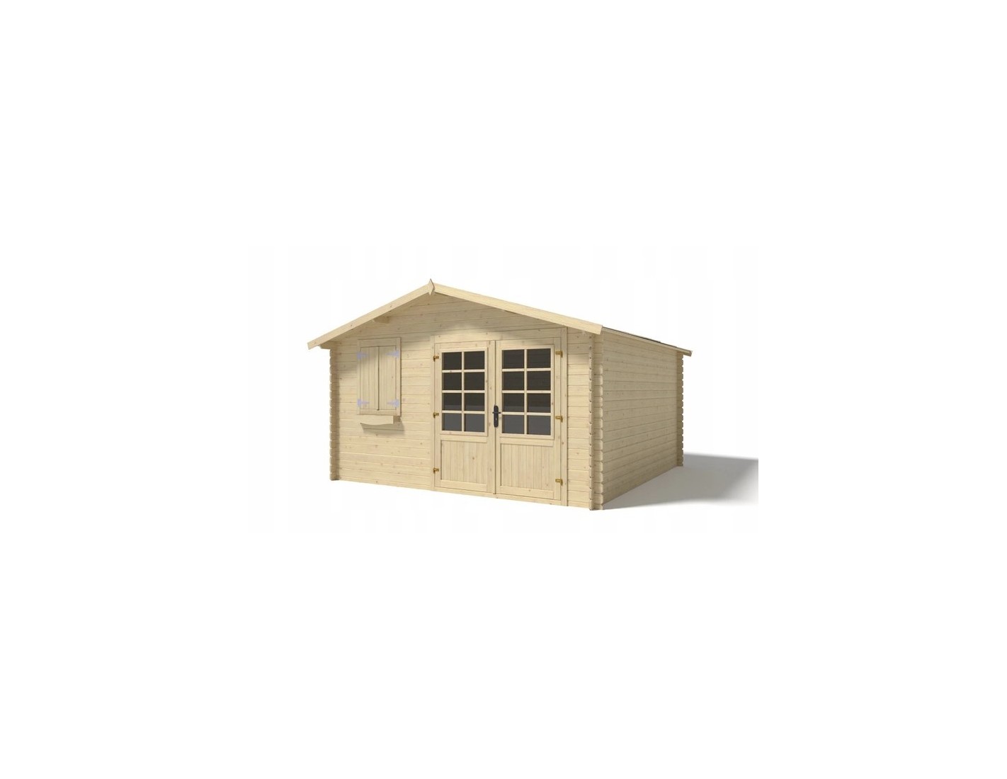 Caseta de jardín con terraza, de superficie de 28 m2, ancho frontal 4 m, profundidad 4 m y espesor de pared de 28 mm.