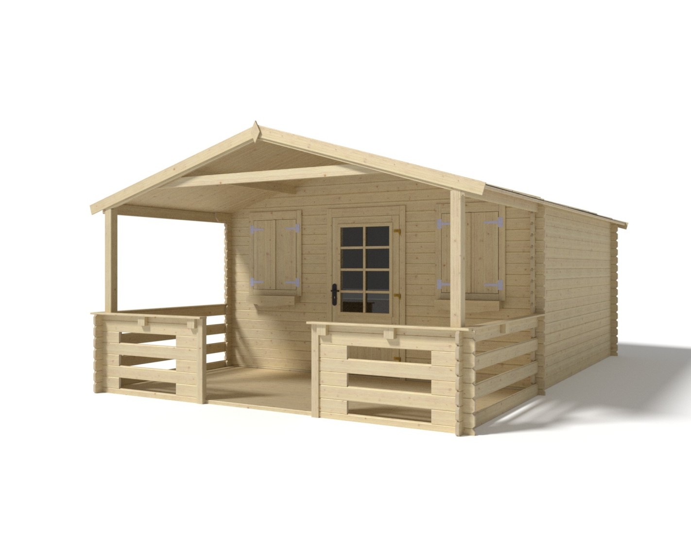 Caseta de jardín con terraza, de superficie de 20 m2, ancho frontal 4 m, profundidad 3 m y espesor de pared de 28 mm.