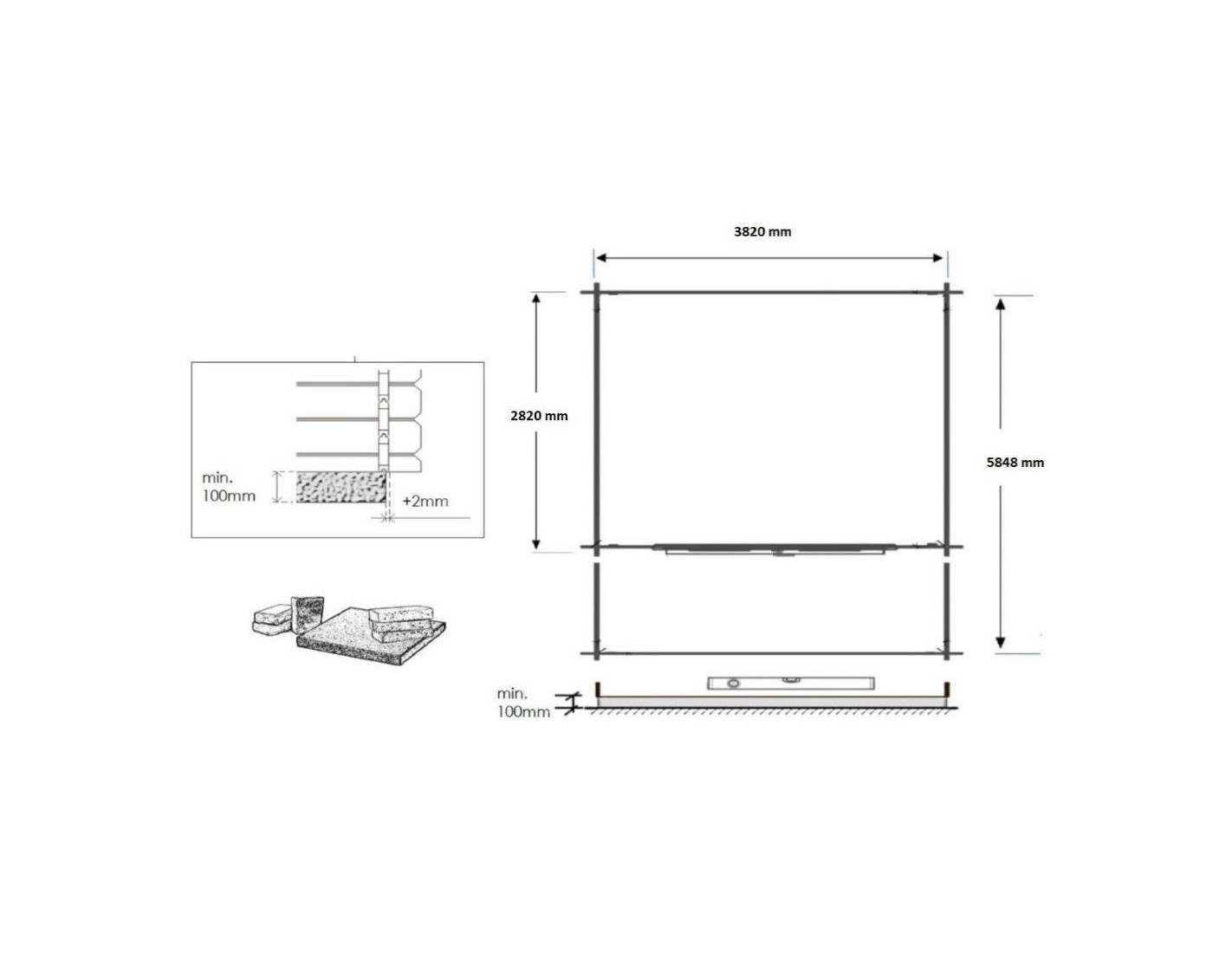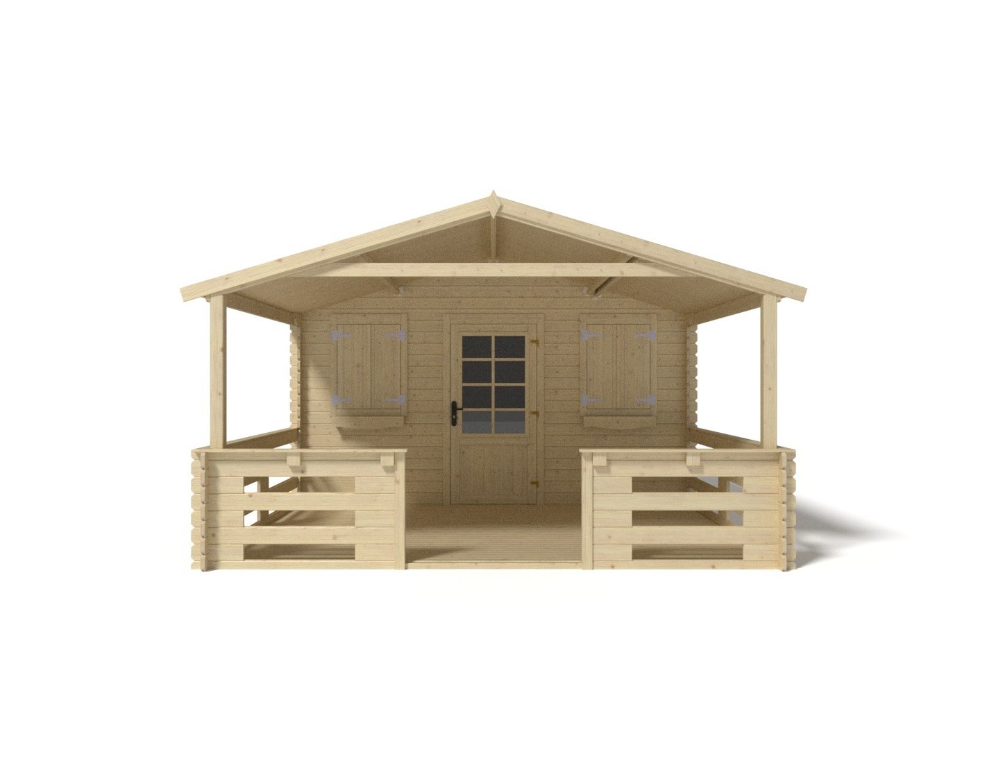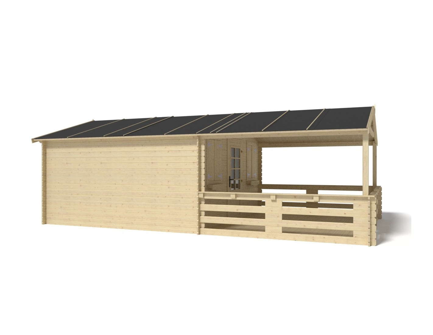 Caseta de jardín con terraza, de superficie de 24 m2, ancho frontal 4 m, profundidad 3 m y espesor de pared de 28 mm.