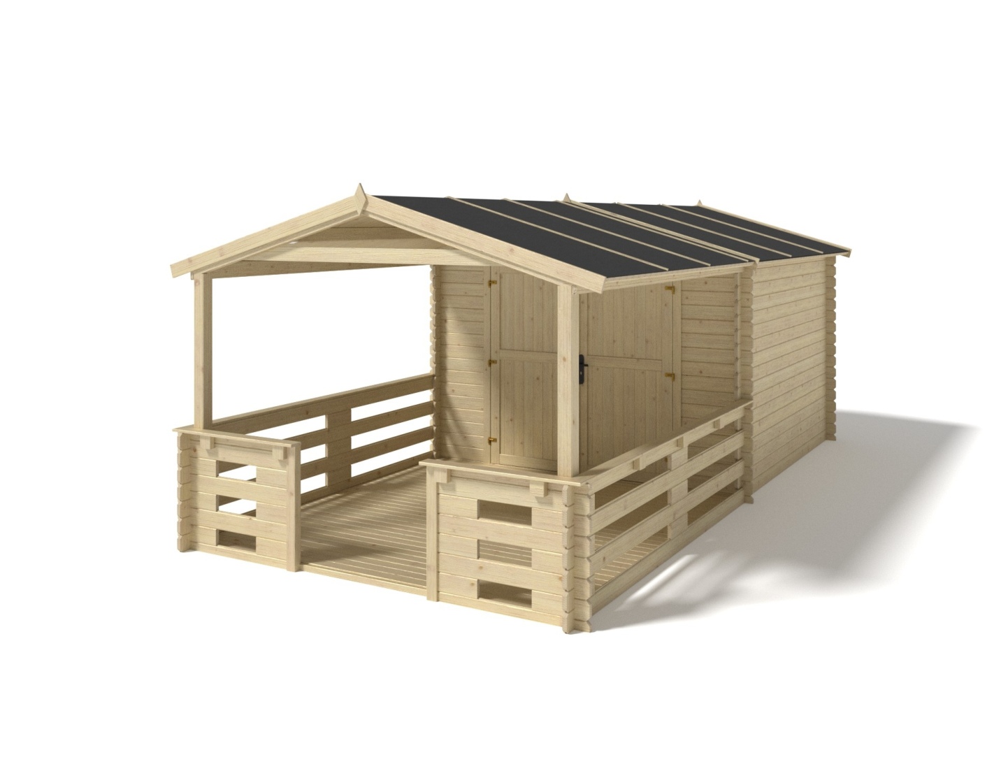 Caseta de jardín con terraza, de superficie de 18 m2, ancho frontal 3 m, profundidad 3 m y espesor de pared de 28 mm.