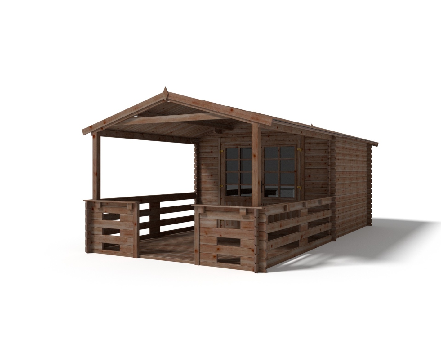 Caseta de jardín con terraza, de superficie de 18 m2, ancho frontal 3 m, profundidad 3 m y espesor de pared de 28 mm.