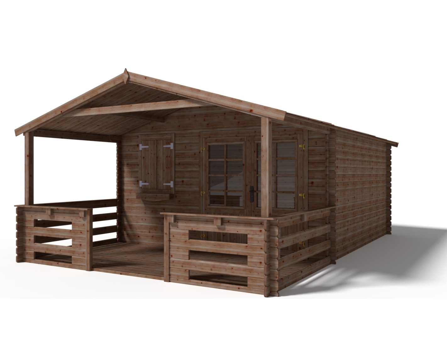 Caseta de jardín con terraza, de superficie de 28 m2, ancho frontal 4 m, profundidad 4 m y espesor de pared de 28 mm.