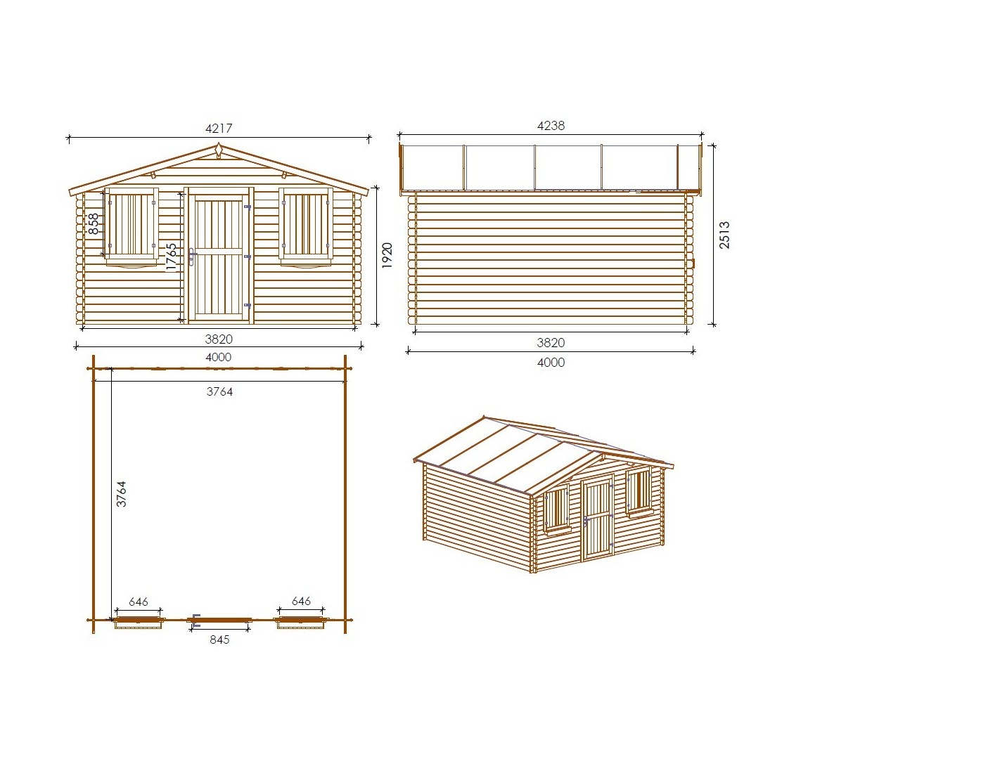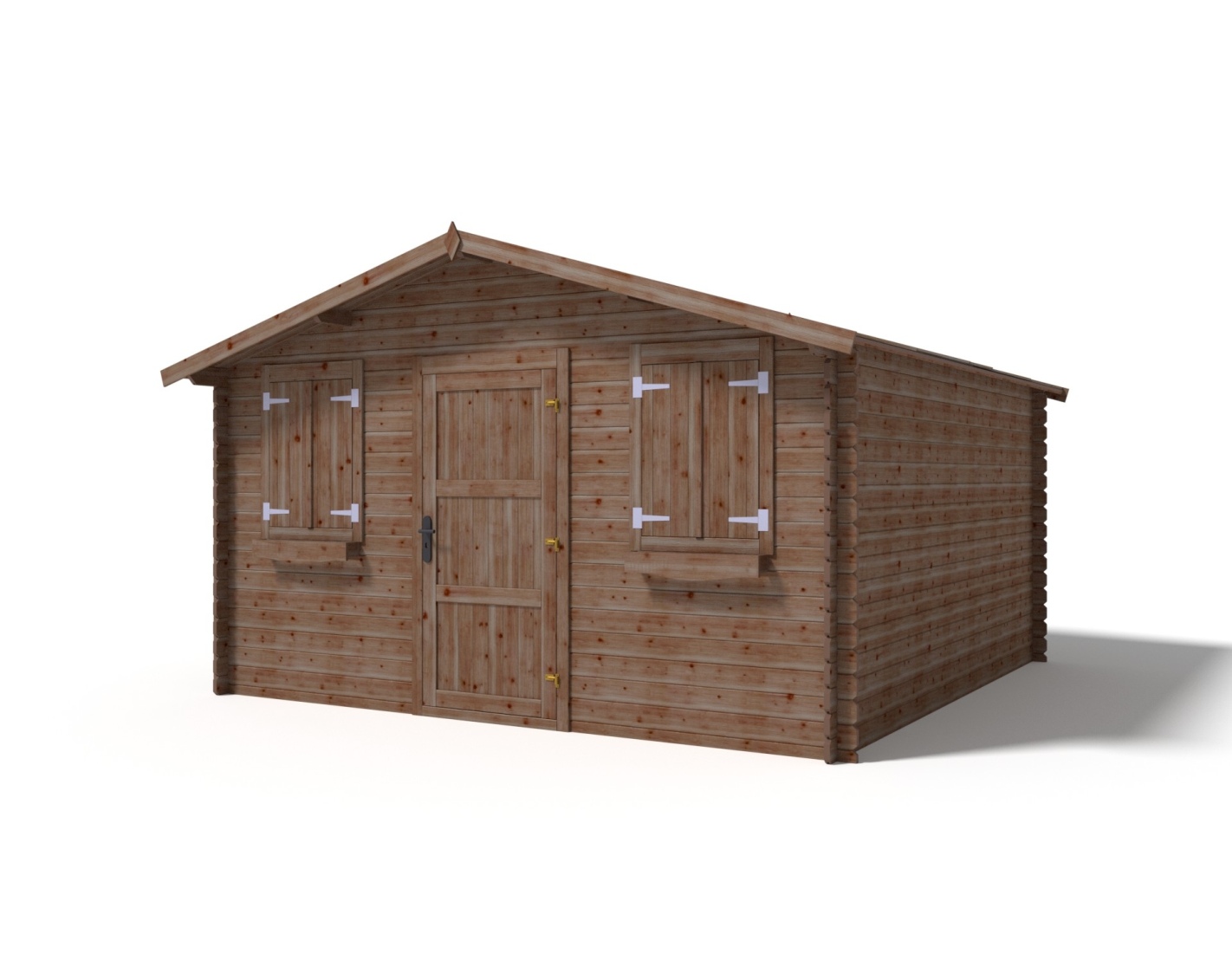 Caseta de jardín con terraza, de superficie de 28 m2, ancho frontal 4 m, profundidad 4 m y espesor de pared de 28 mm.