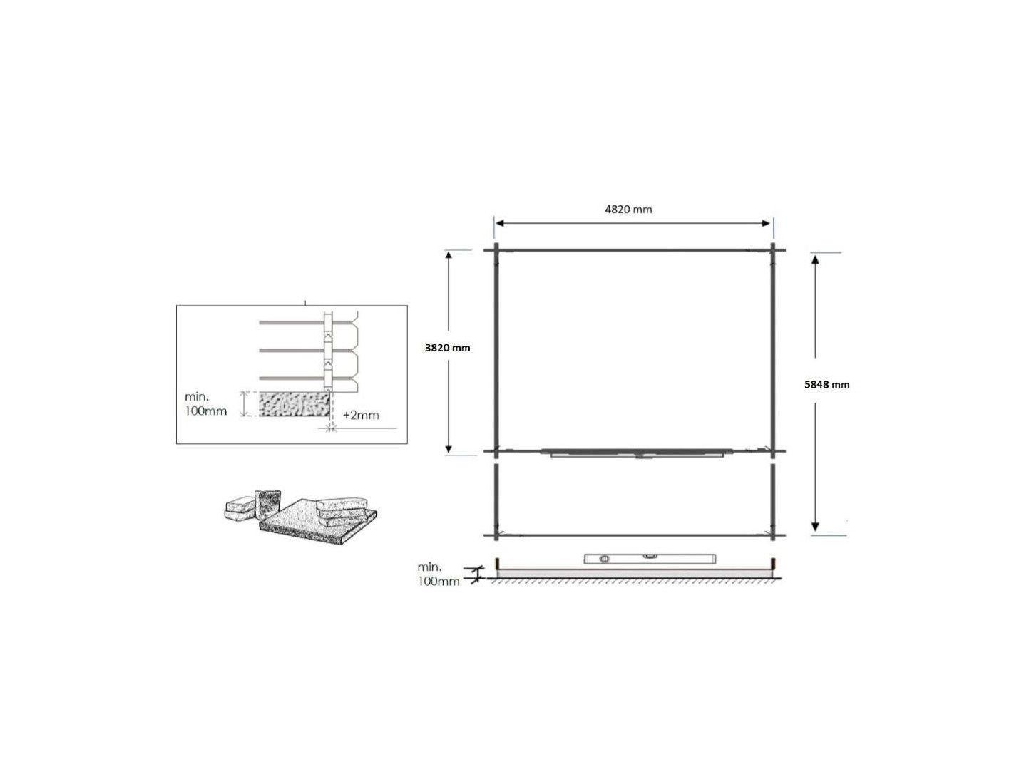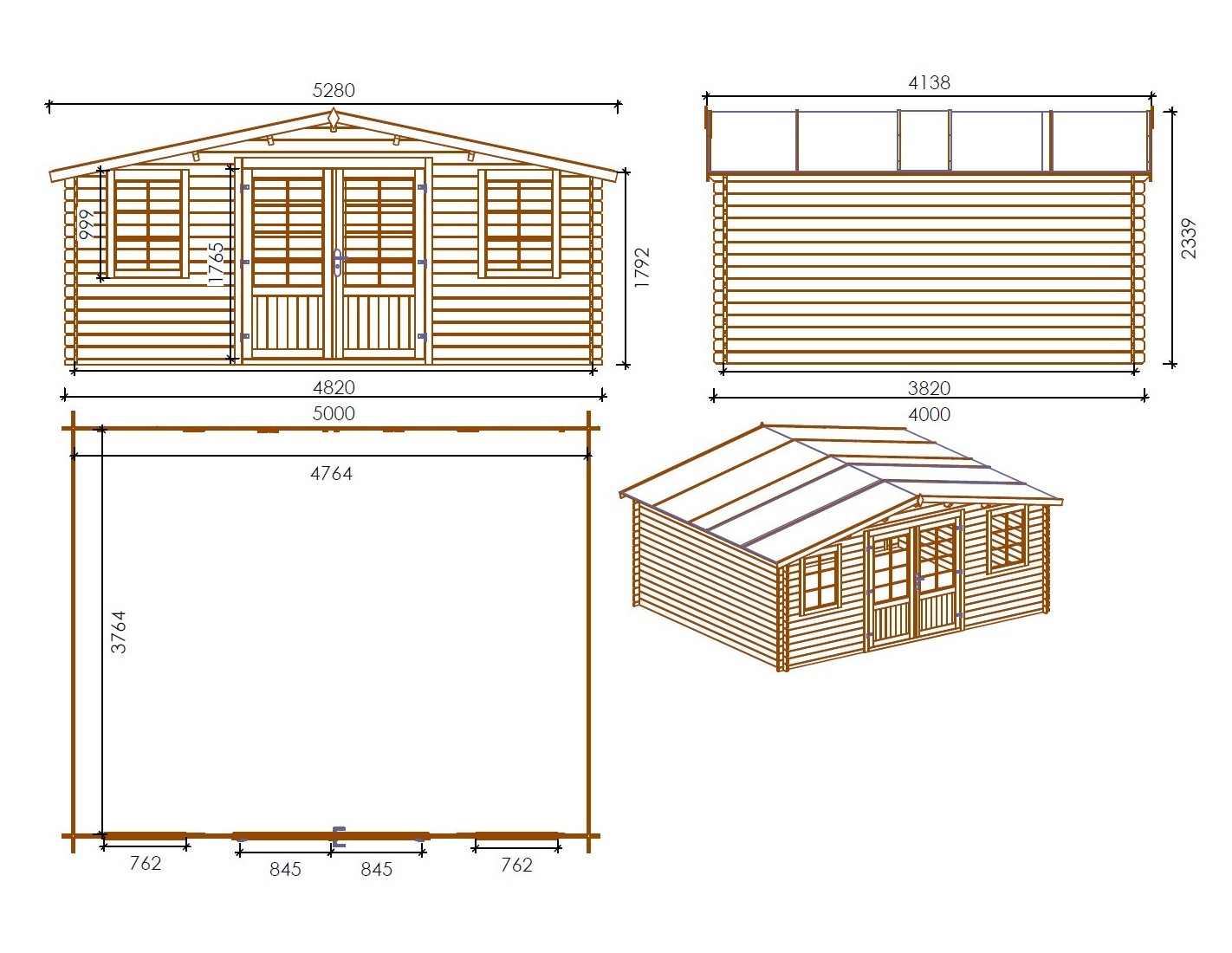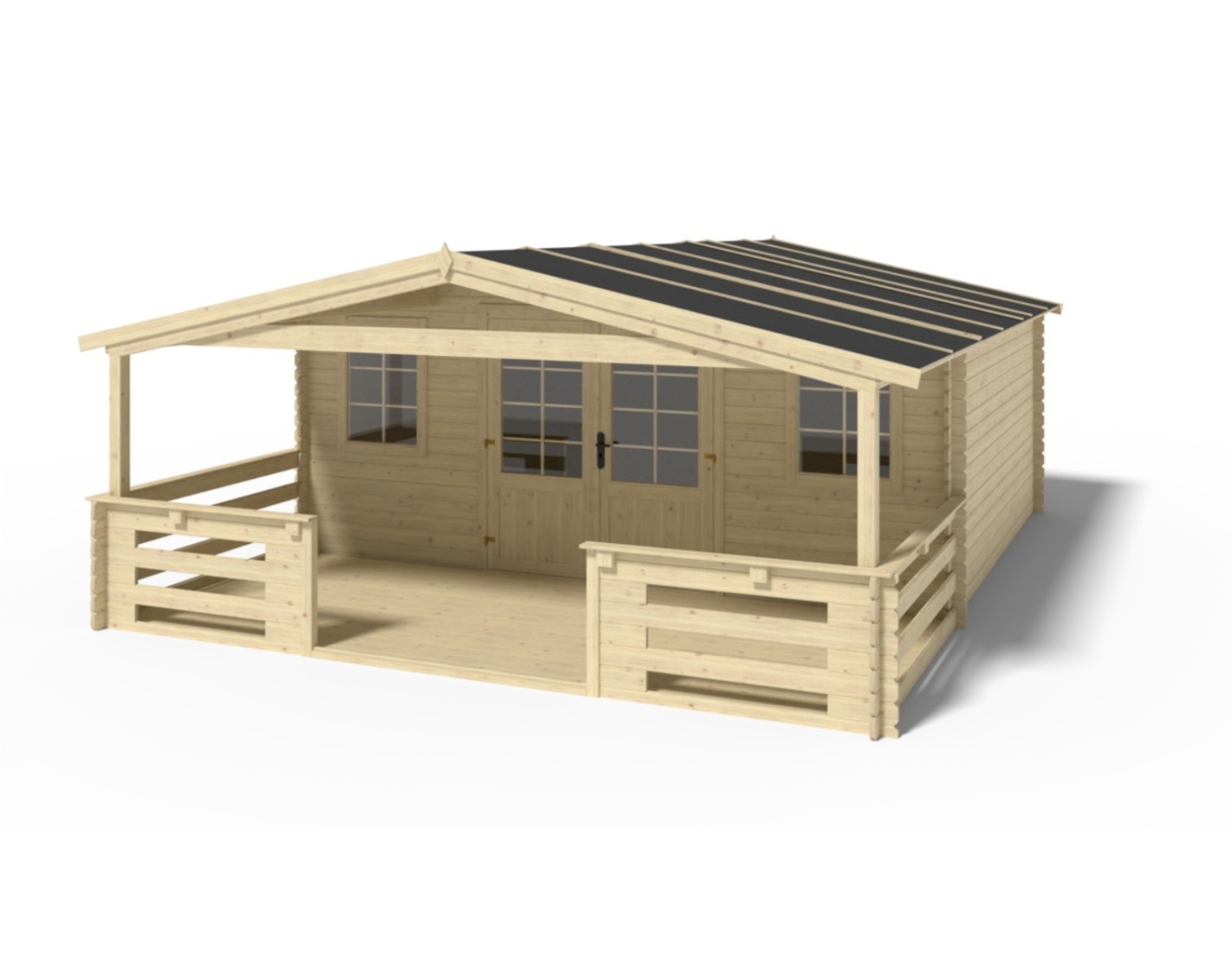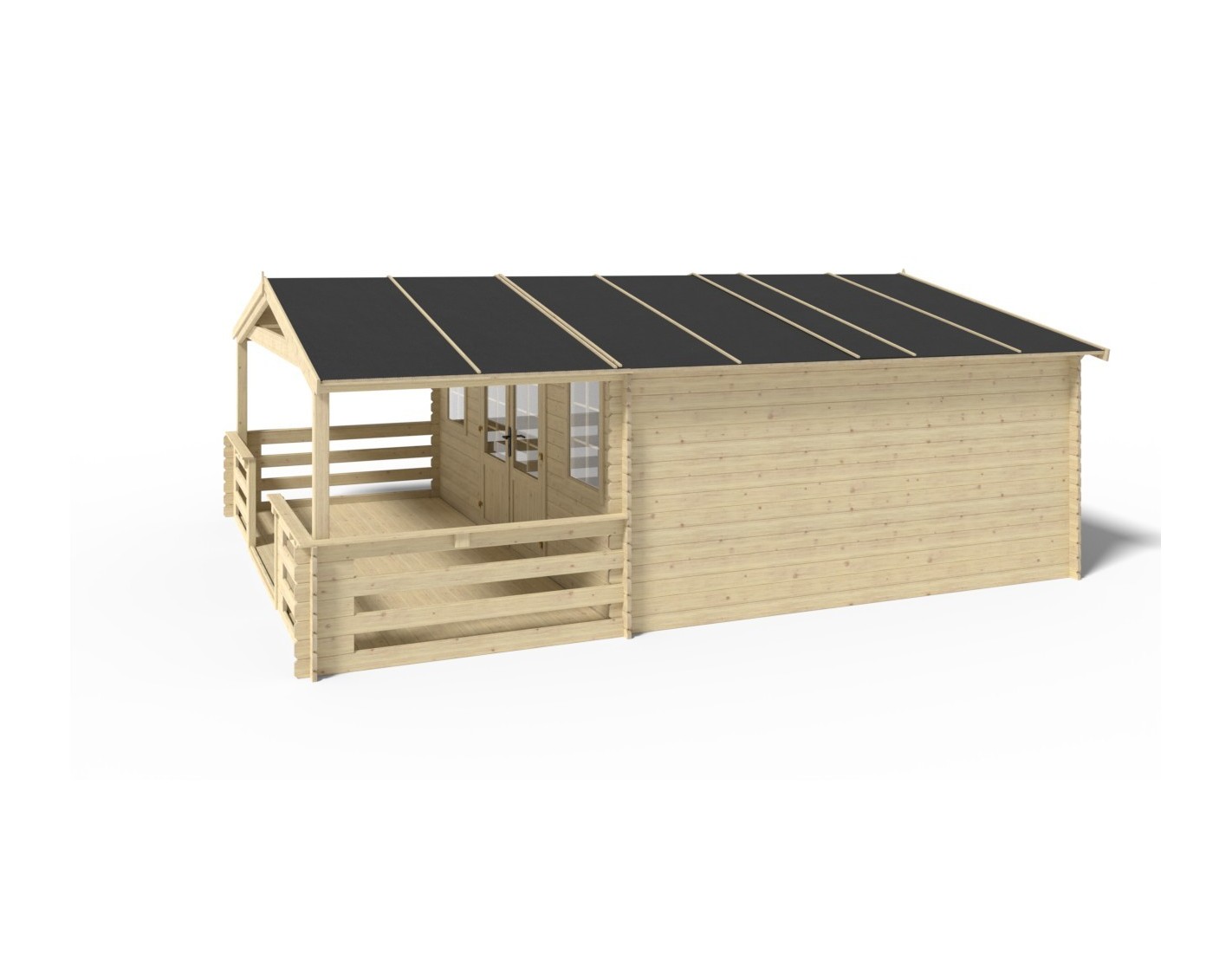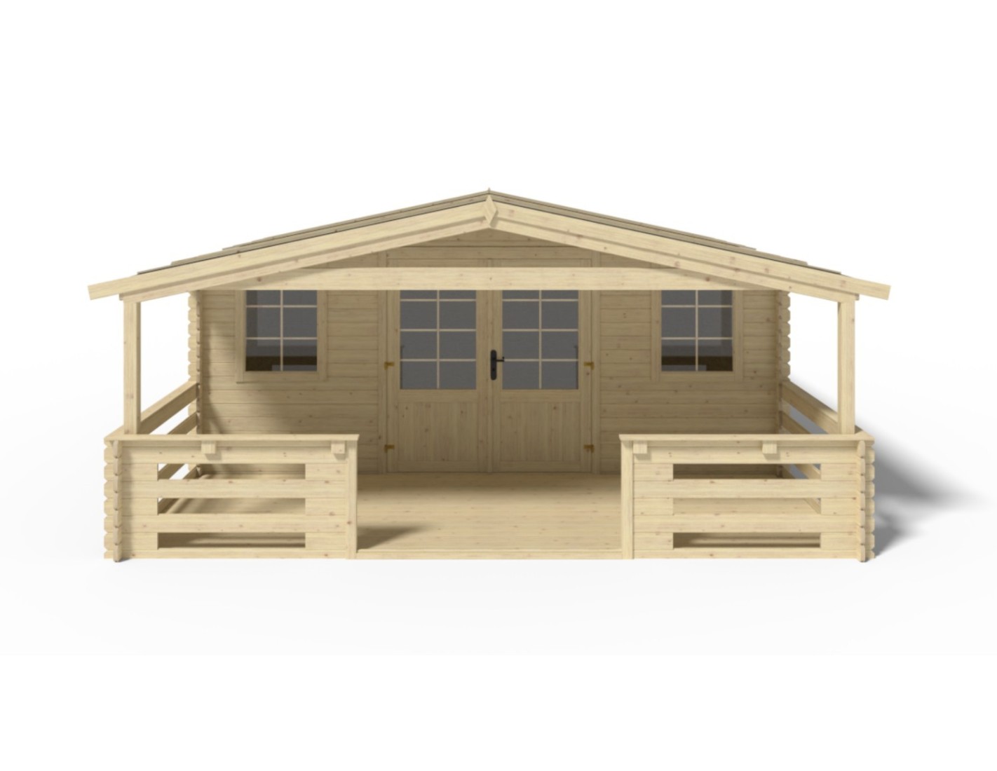 Caseta de jardín con terraza, de superficie de 30 m2, ancho frontal 5 m, profundidad 4 m y espesor de pared de 28 mm.