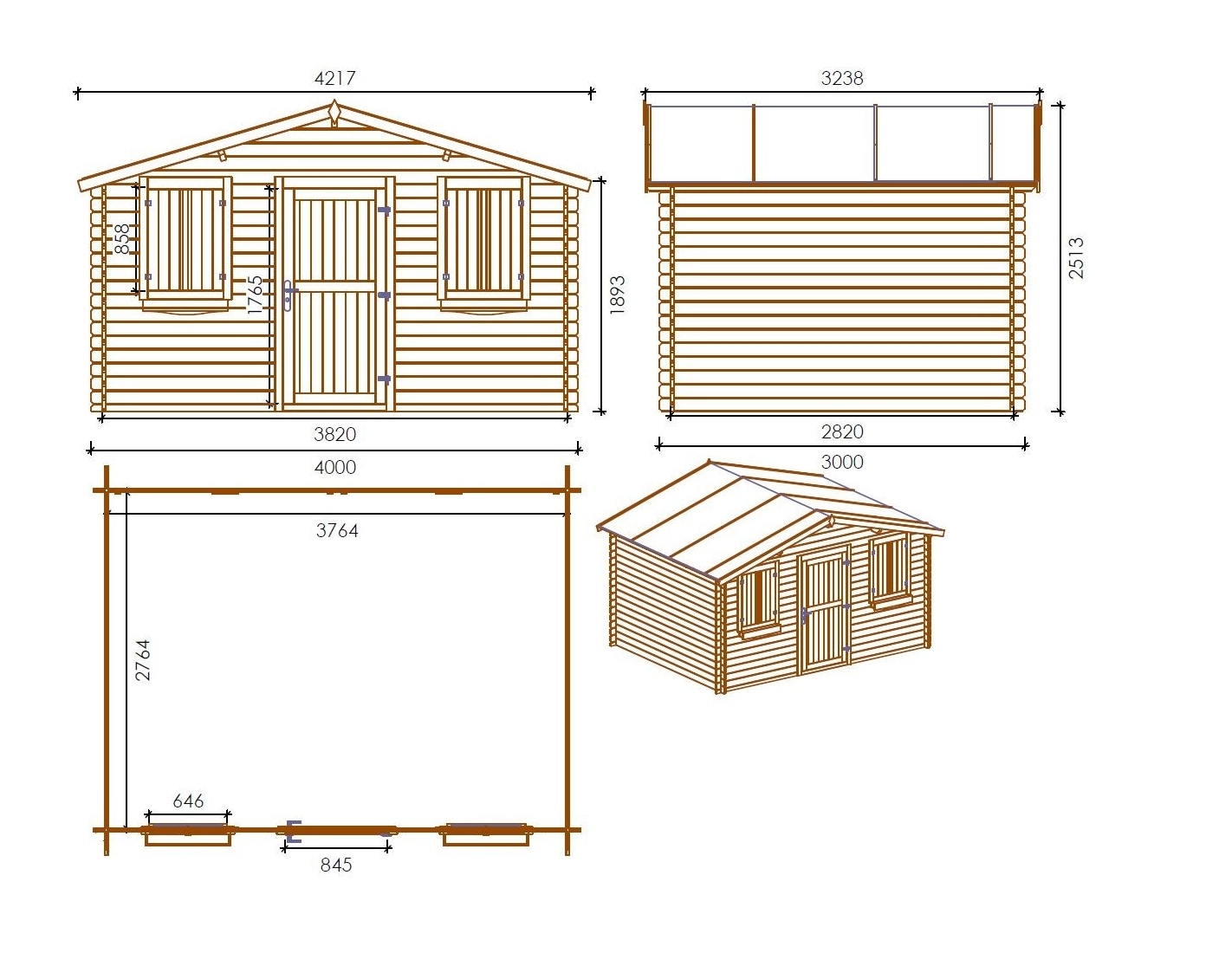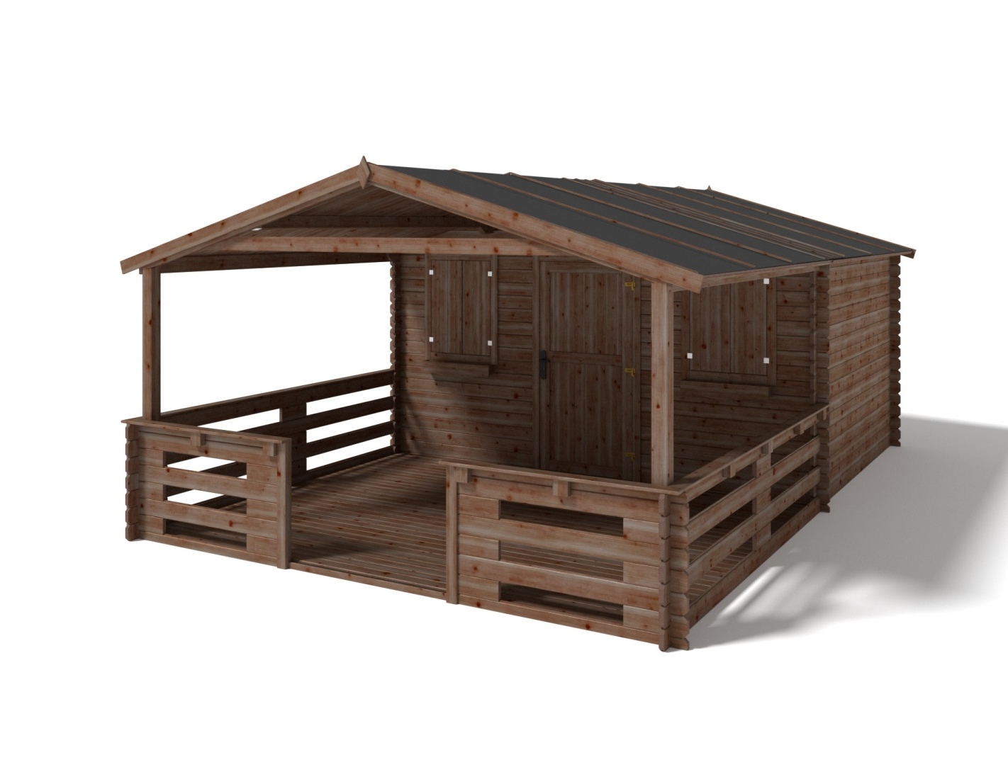 Caseta de jardín con terraza, de superficie de 24 m2, ancho frontal 4 m, profundidad 3 m y espesor de pared de 28 mm.