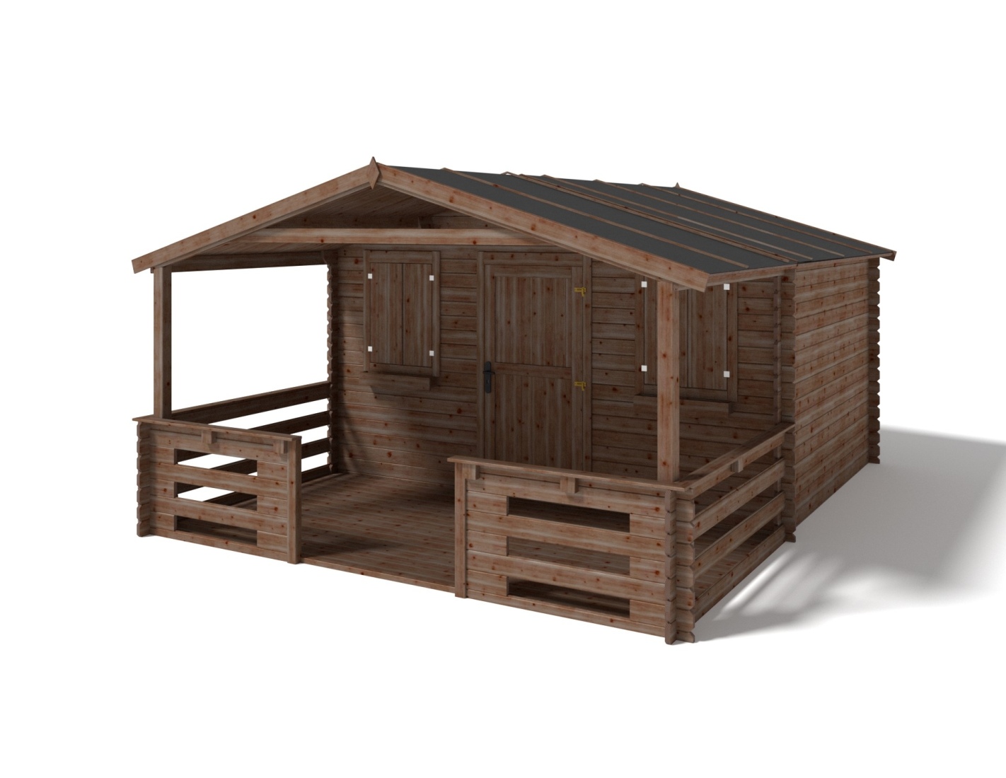 Caseta de jardín con terraza, de superficie de 20 m2, ancho frontal 4 m, profundidad 3 m y espesor de pared de 28 mm.