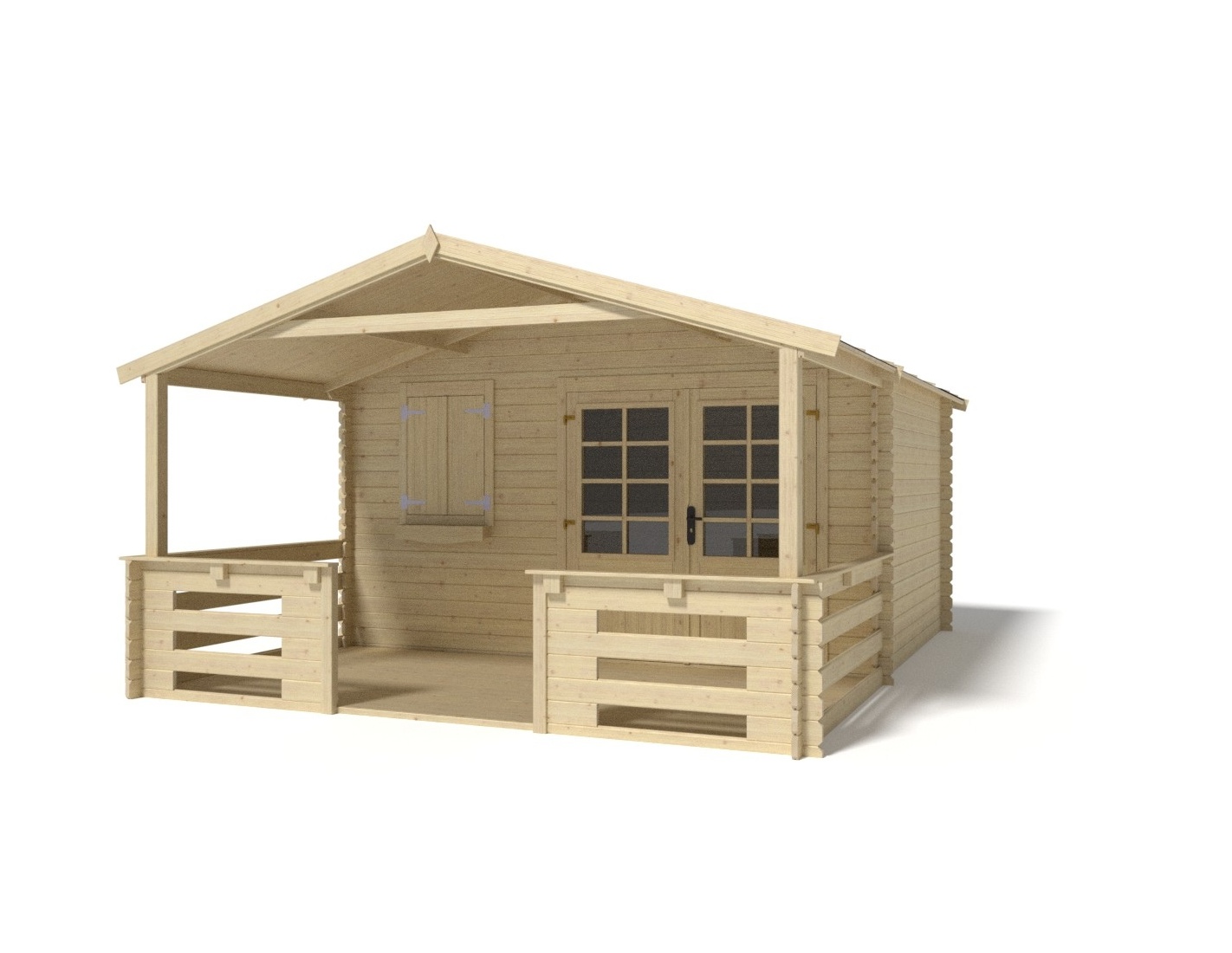 Caseta de jardín con terraza, de superficie de 24 m2, ancho frontal 4 m, profundidad 3 m y espesor de pared de 28 mm.