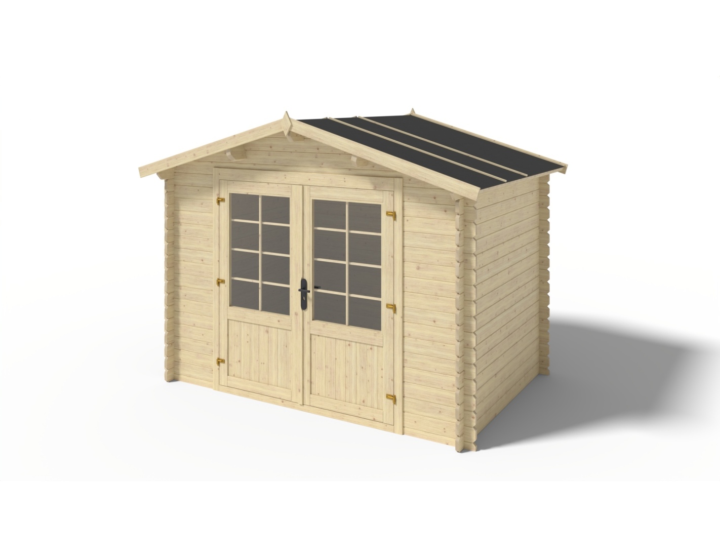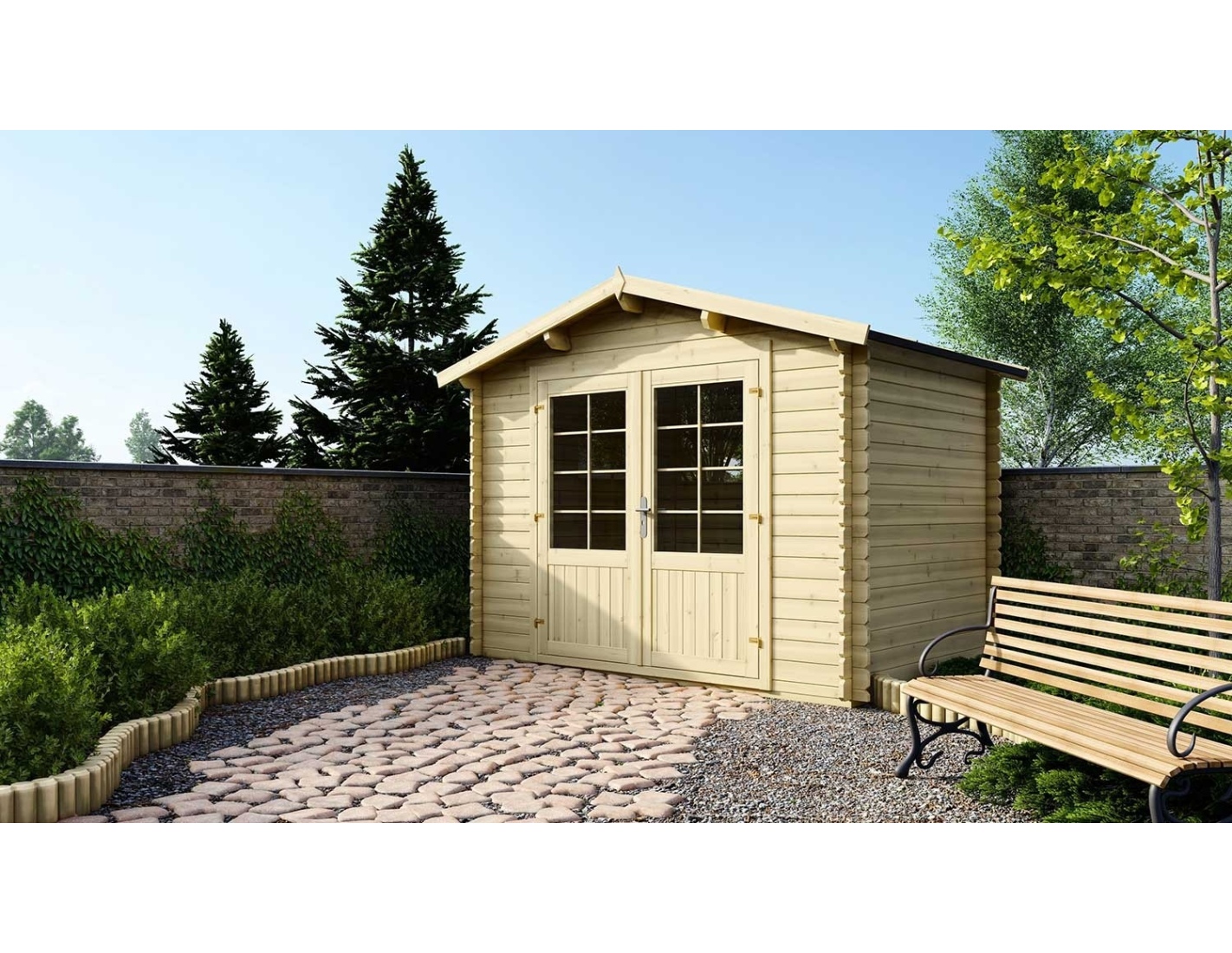 Caseta de madera para herramientas DOM420 de superficie de 6 m2, ancho de 3 m, profundidad de 2 m y espesor de pared de 28 mm. La caseta es fácil de montar, las instrucciones de montaje están incluidas.