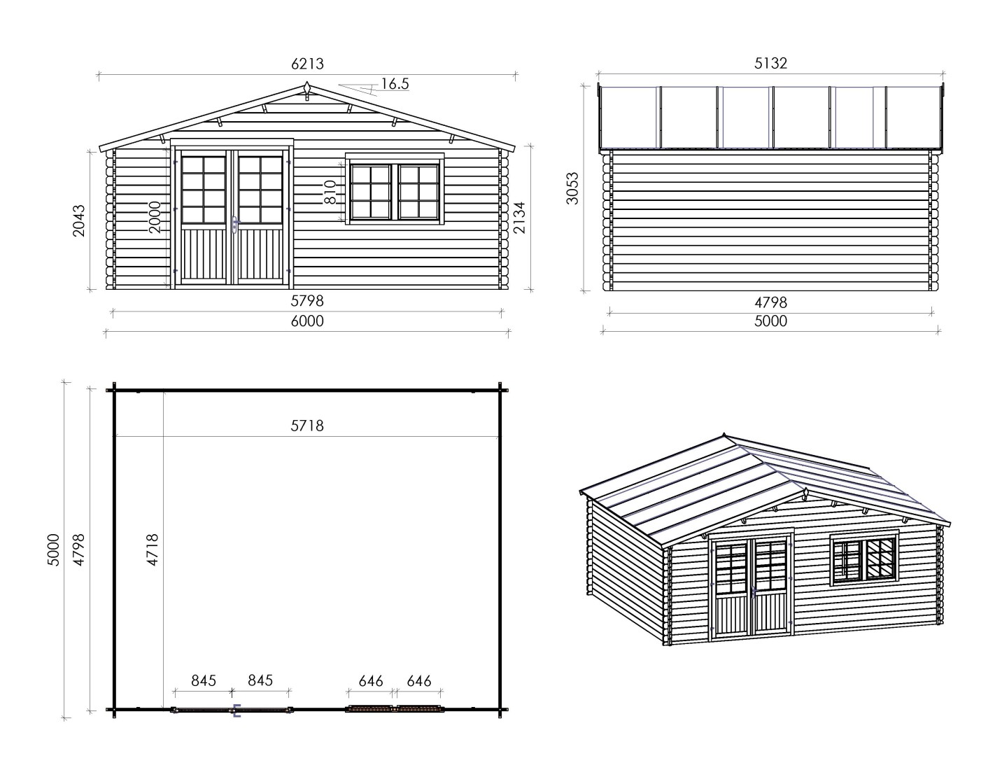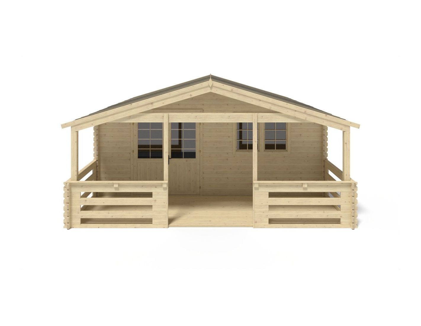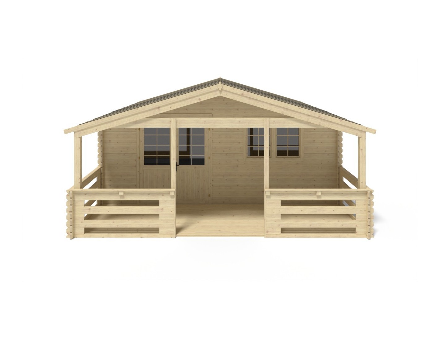 Caseta de jardín con terraza, de superficie de 48 m2, ancho frontal 6 m, profundidad 5 m y espesor de pared de 40 mm.