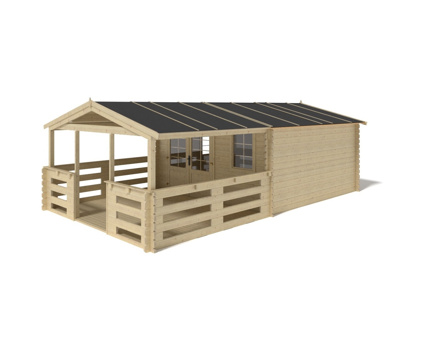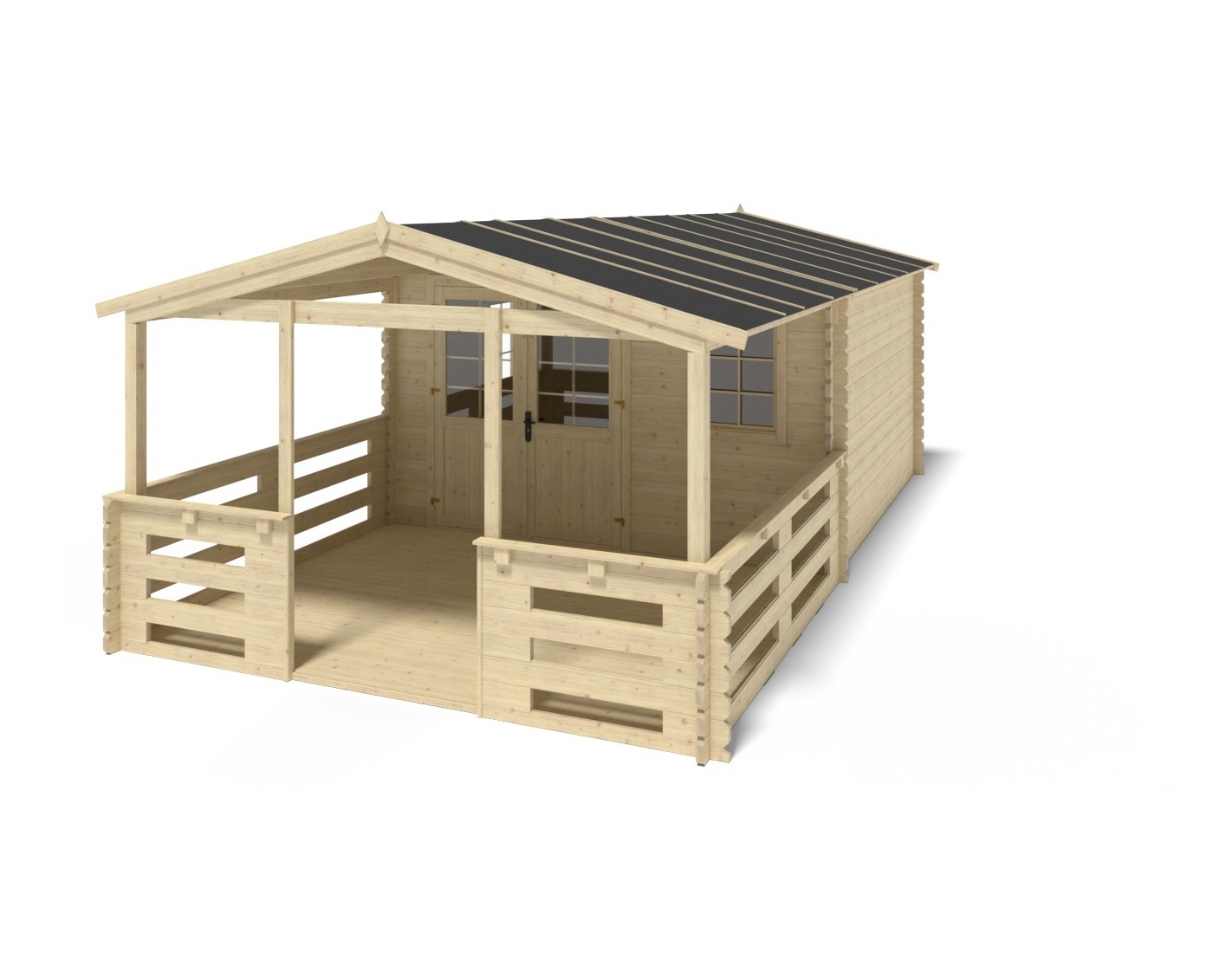 Caseta de jardín con terraza, de superficie de 28 m2, ancho frontal 4 m, profundidad 4 m y espesor de pared de 40 mm.