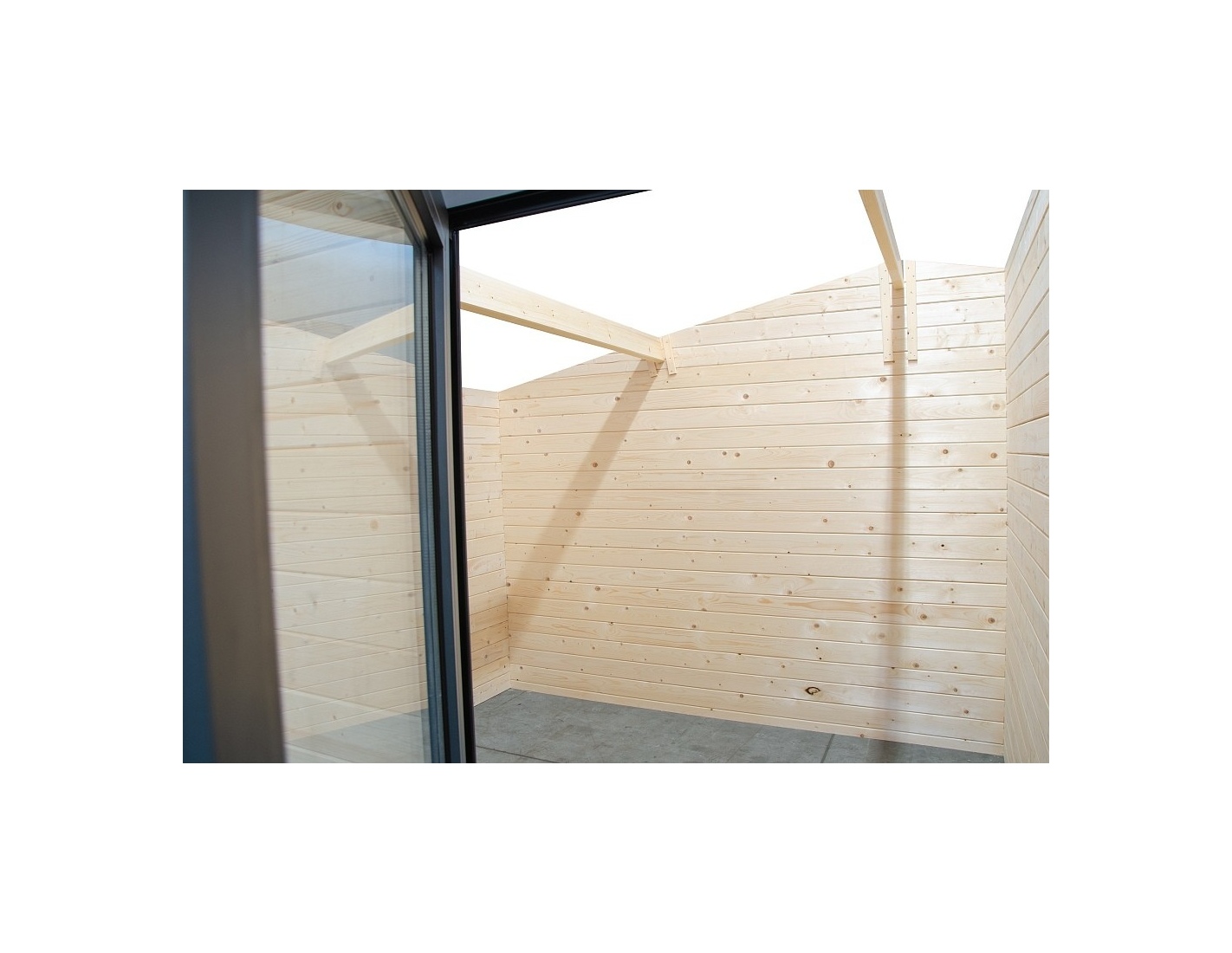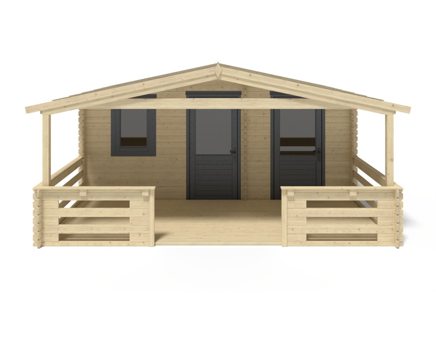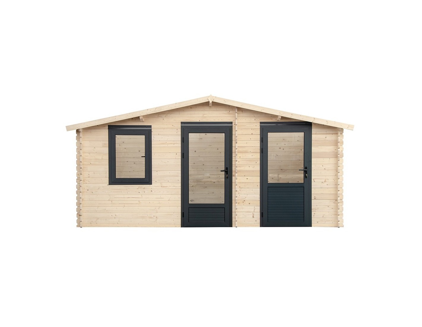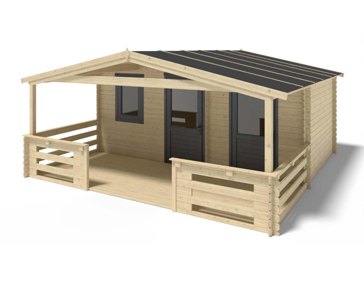 Caseta de jardín con terraza, de superficie de 25 m2, ancho frontal 5 m, profundidad 3 m y espesor de pared de 28 mm.