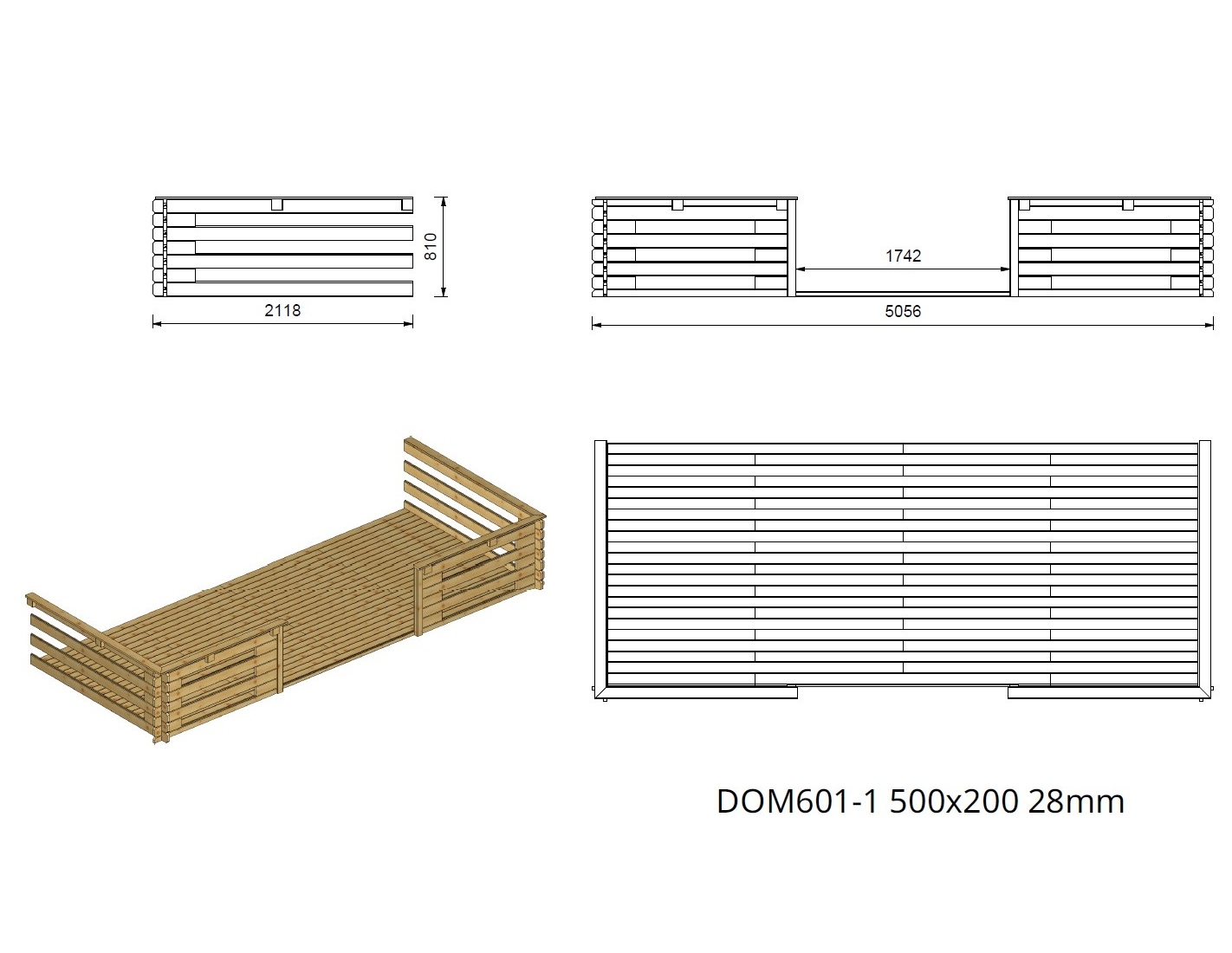 El producto DOM638+DOM600+DOM601+POD04 no está impregnado. Debe ser tratado inmediatamente, con agentes protectores de madera disponibles en el mercado. El mantenimiento posterior debe llevarse a cabo según sea necesario, pero al menos, cada 2 años. Sin embargo, es importante recordar que la madera es un material vivo y es natural que trabaje con los cambios de temperatura y humedad. Los cambios en el color y estructura de la madera dependen de las condiciones en las que se encuentre y no afectan su calidad.