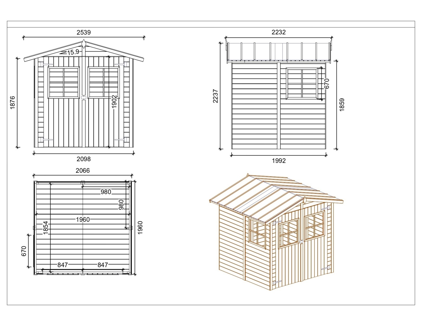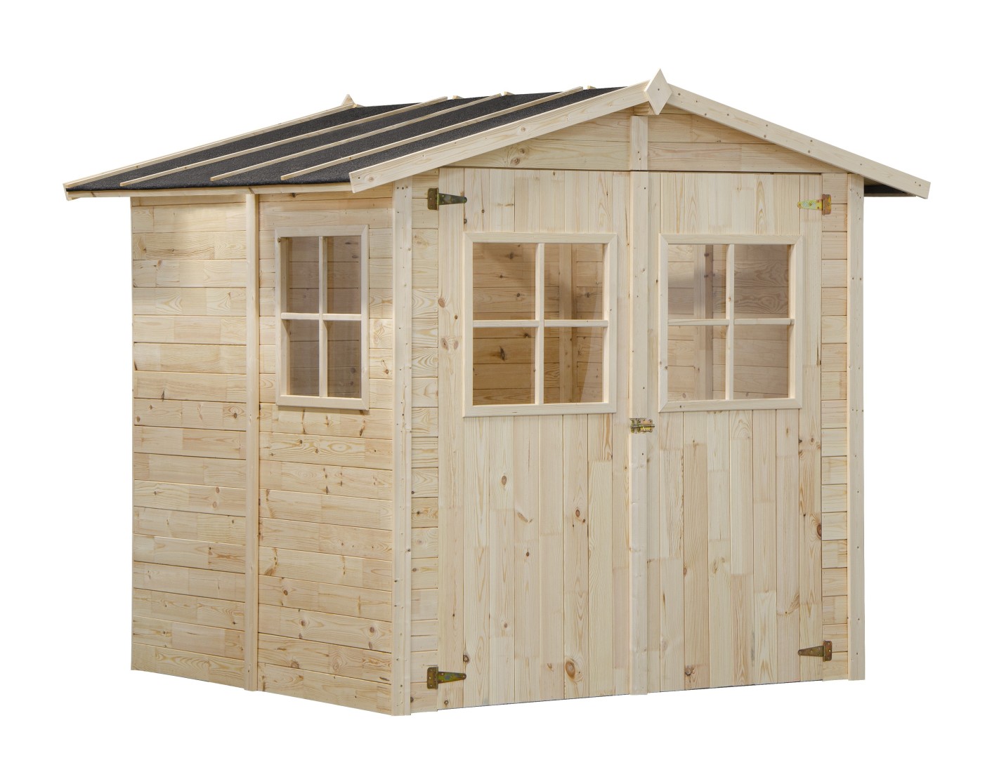 Caseta de madera para herramientas DOM645 de superficie 4.18 m2, ancho frontal de 2.07 m, profundidad 1.96 m y espesor de pared de 18 mm. El montaje de la caseta, gracias a las instrucciones adjuntas al producto, no causa mayores problemas.