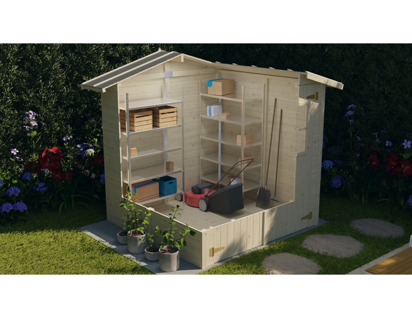 La caseta de jardín sirve perfectamente como espacio de almacenamiento para herramientas, equipos de jardinería o muebles. El interior tiene una forma regular, lo que facilita su disposición y adaptación a las necesidades individuales. La caseta de jardín de madera es duradera y fácil de mantener, lo que te permitirá disfrutar de ella durante muchos años.
