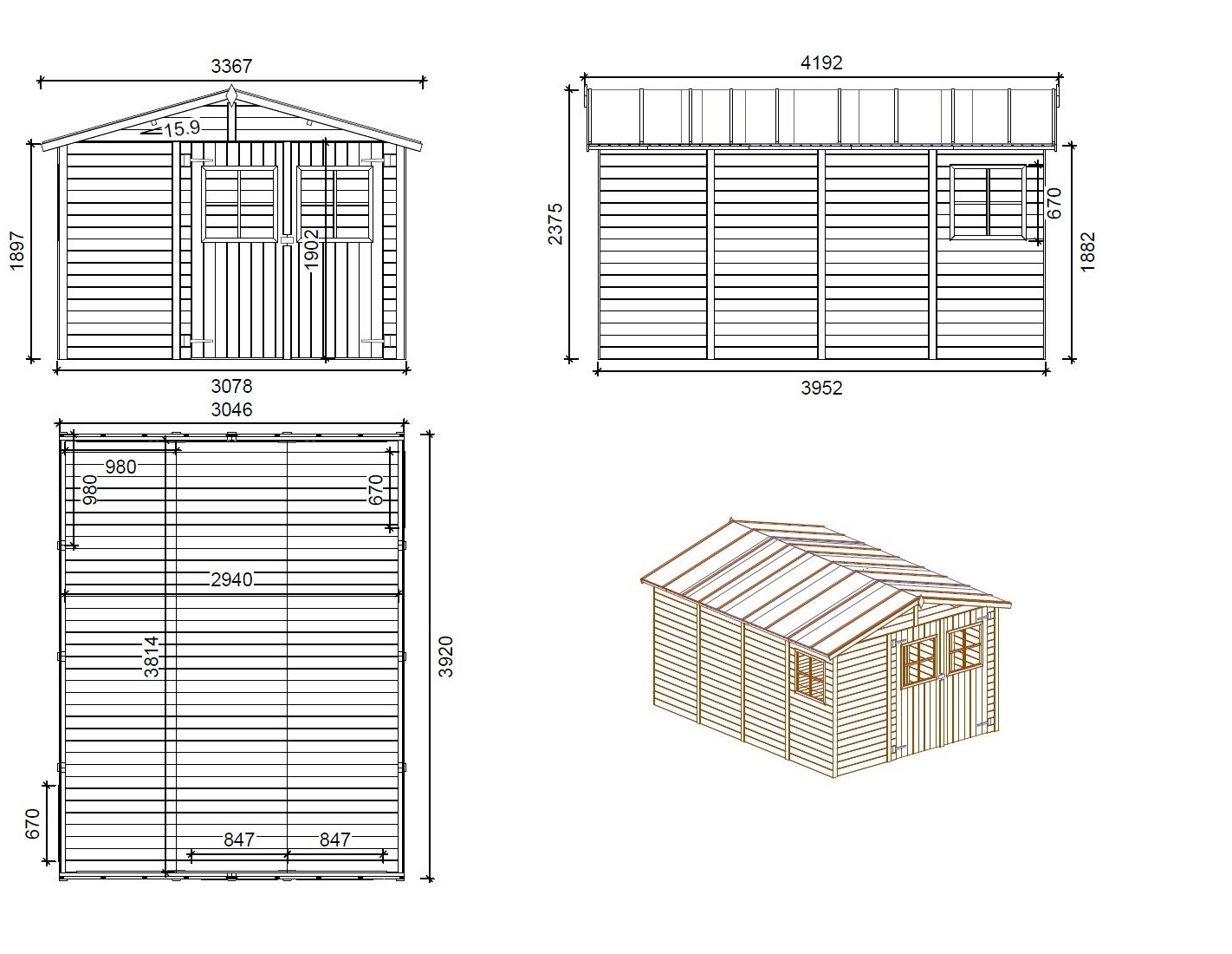 Caseta de madera para herramientas DOM649 de superficie 11.95 m2, ancho frontal de 3.05 m, profundidad 3.92 m y espesor de pared de 18 mm. El montaje de la caseta, gracias a las instrucciones adjuntas al producto, no causa mayores problemas.
