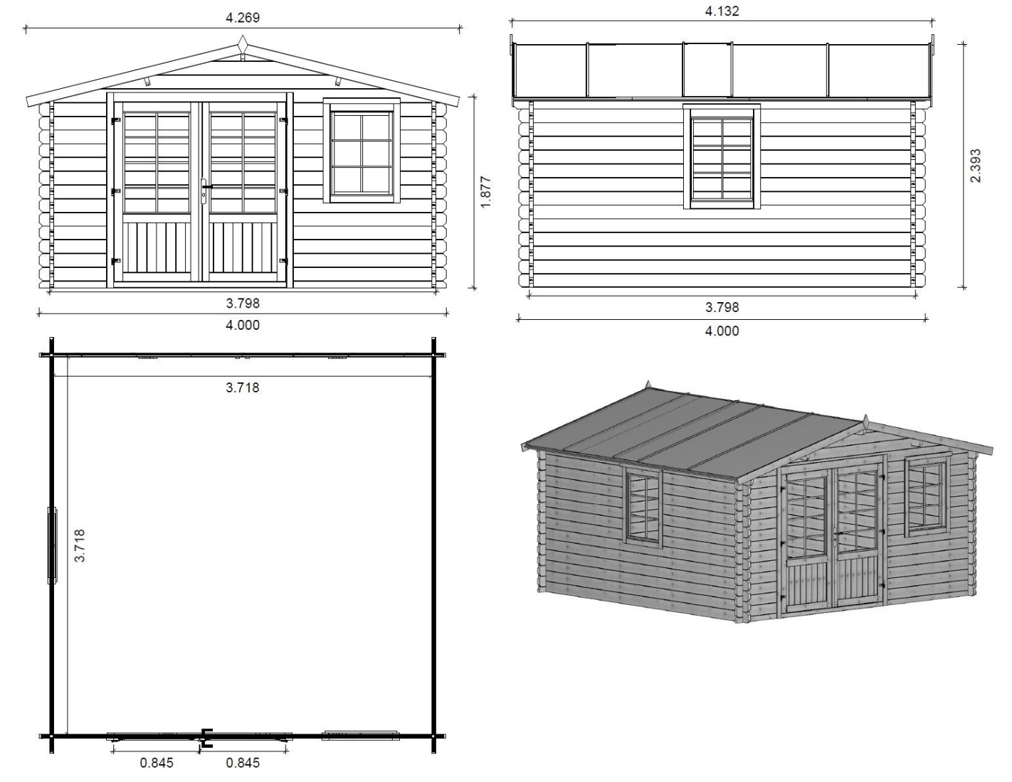 Caseta de jardín con terraza, de superficie de 28 m2, ancho frontal 4 m, profundidad 4 m y espesor de pared de 40 mm.
