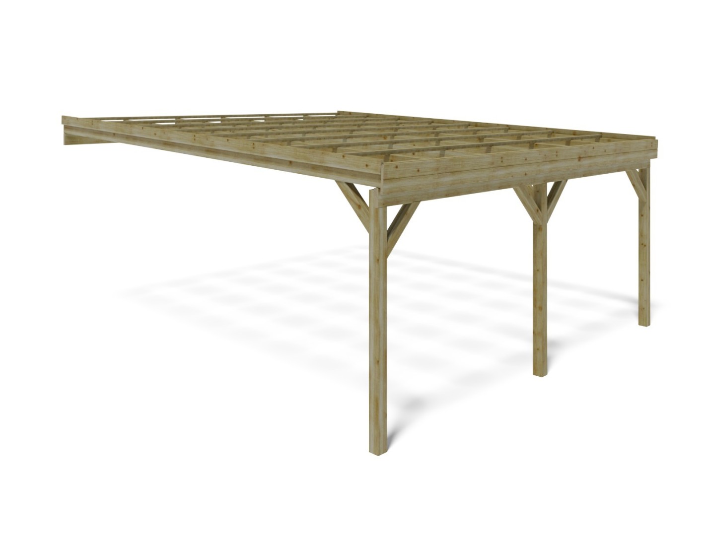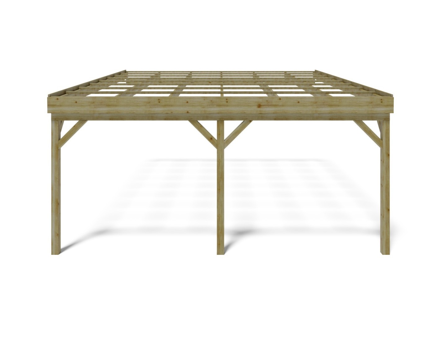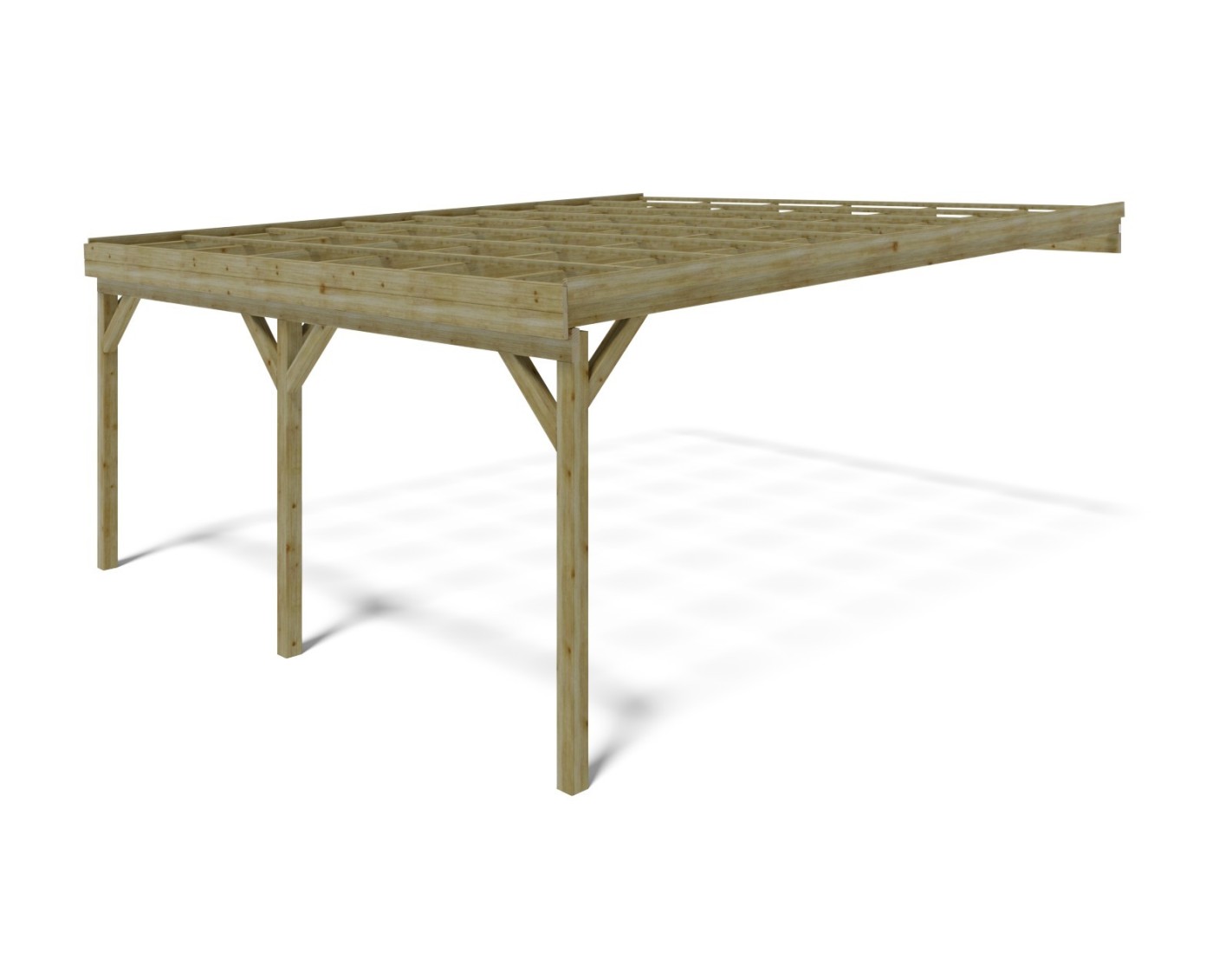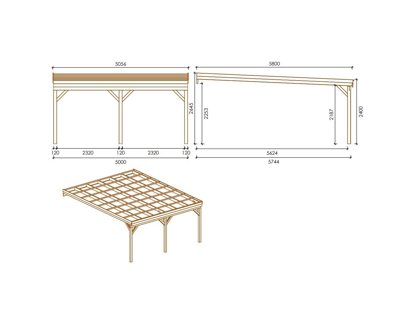 Cochera CAR23 de ancho de 5.8 m, produndidad de 5.06 m y altura de entrada de 2.19 m puede utilizarse como tejado para una plaza de aparcamiento o, por ejemplo, como tejado de terraza. El montaje de la cochera, gracias a las instrucciones adjuntas al producto, no causa mayores problemas.