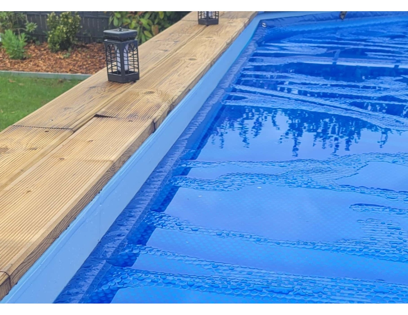 Cobertor de burbujas de verano para piscinas, cortado a la forma y medida del interior de la piscina.Polietileno 400 µColor azul oscuroLos bordes del cobertor están cosidos y son duraderos.