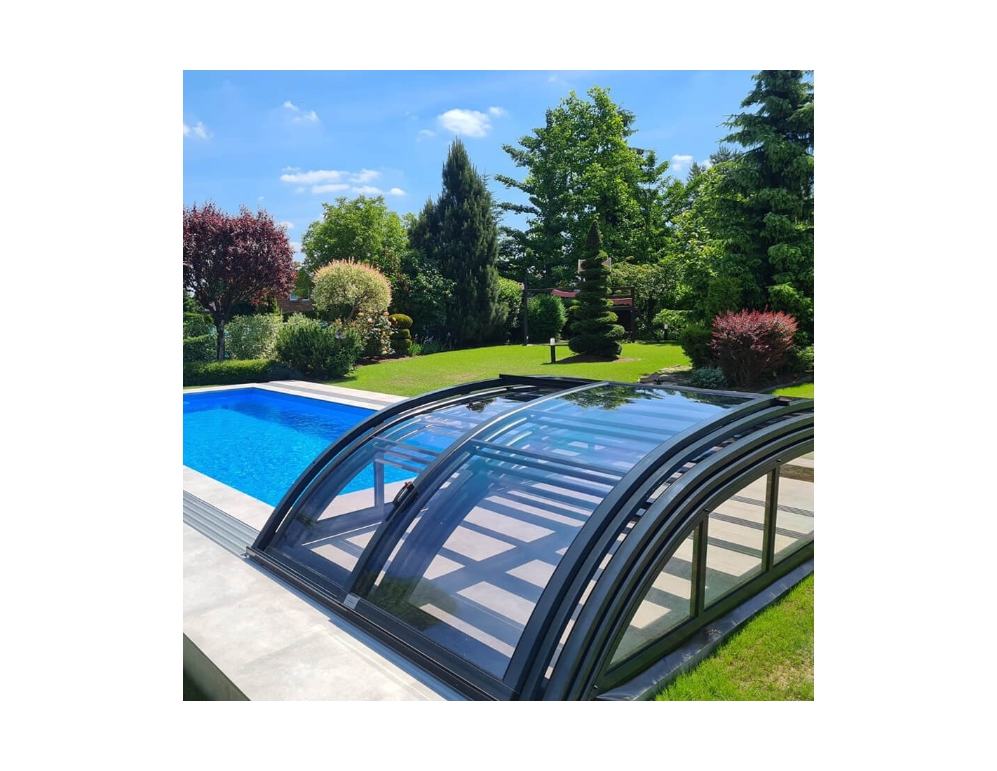 La cubierta es resistente y cumple perfectamente sus funciones principales: mantener el agua limpia, proteger contra las bajas temperaturas y las condiciones climáticas variables. Es un elemento decorativo y funcional de tu piscina. No es muy alta, pero aun así permite utilizar la piscina con los segmentos cerrados.