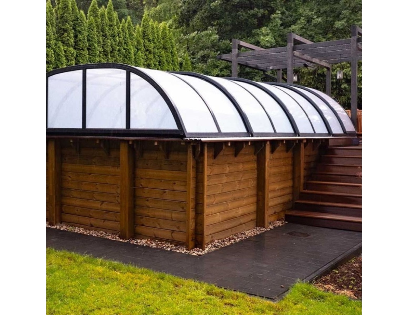 La cubierta es resistente y cumple perfectamente sus funciones principales: mantener el agua limpia, proteger contra las bajas temperaturas y las condiciones climáticas variables. Es un elemento decorativo y funcional de tu piscina. No es muy alta, pero aun así permite utilizar la piscina con los segmentos cerrados.