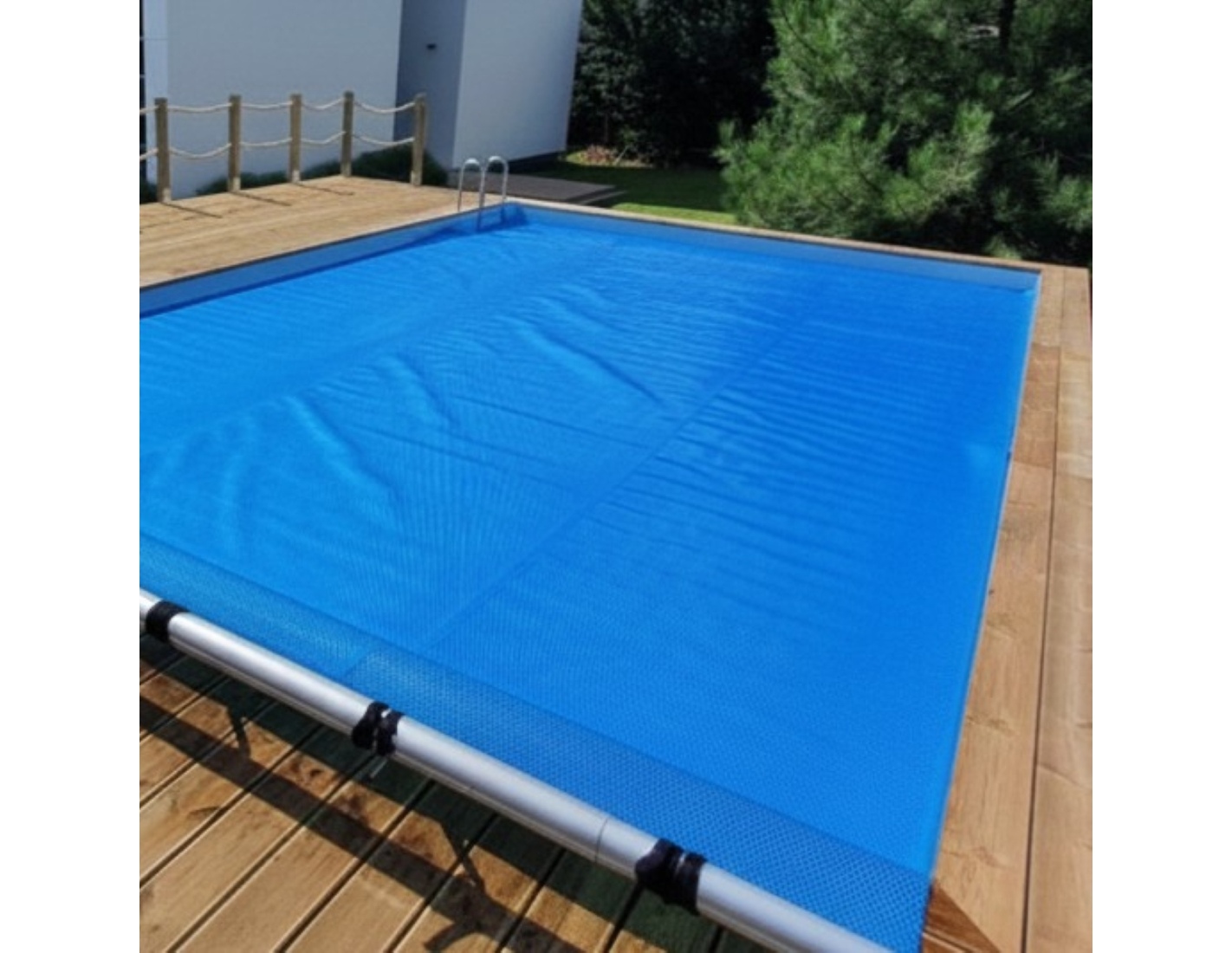 Cobertor de burbujas de verano para piscinas, cortado a la forma y medida del interior de la piscina.Polietileno 400 µColor azul oscuroLos bordes del cobertor están cosidos y son duraderos.