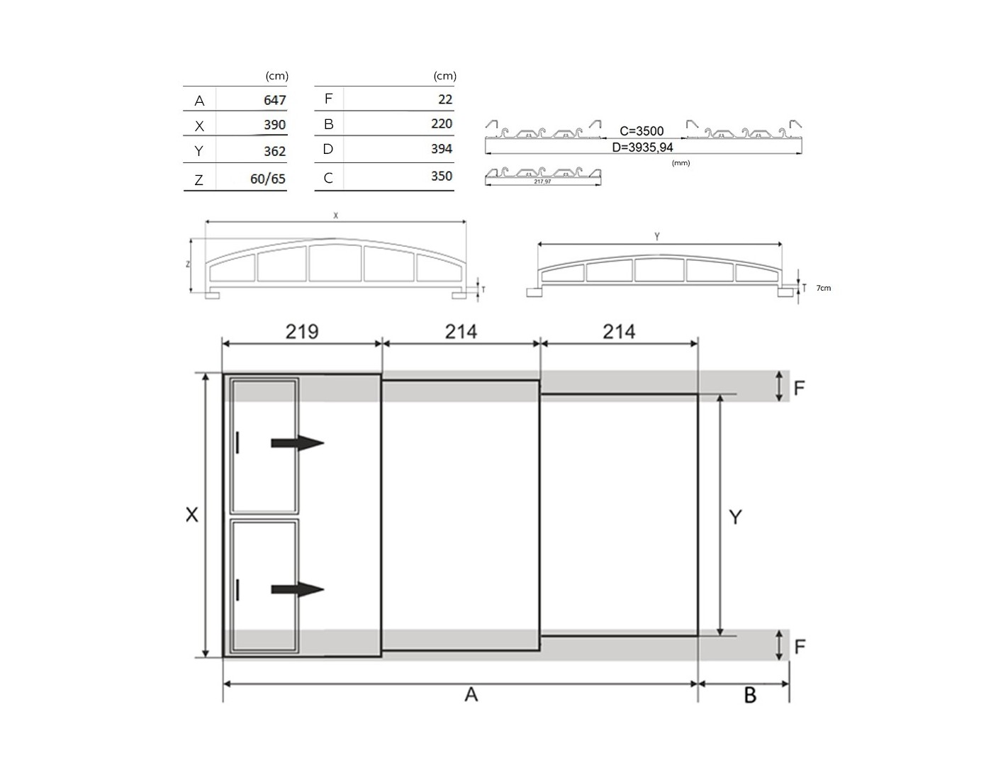- Rieles de largura del cobertor + Extensión 2.2 m